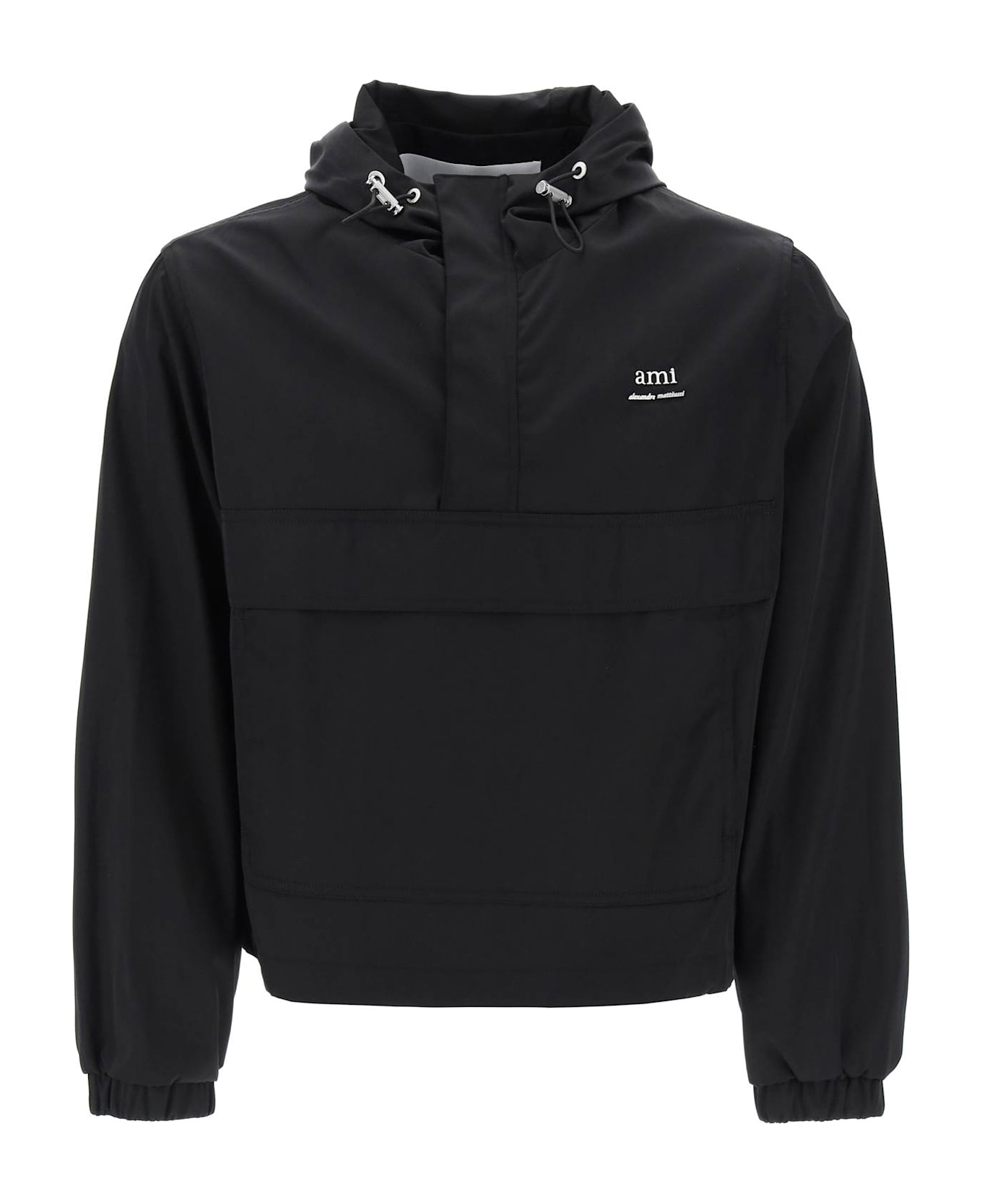 The Ami Paris anorak windbreaker is made of water-repellent twill nylon and cotton, detailed with a contrasting rubber logo on the chest. It features an adjustable hood with drawstring, half zip and hidden snaps closure, a large kangaroo pocket with flap, elasticized cuffs, and adjustable bottom with drawstring. Unlined. The model is 177 cm tall and wears size S. The male model is 187 cm tall and wears size M.