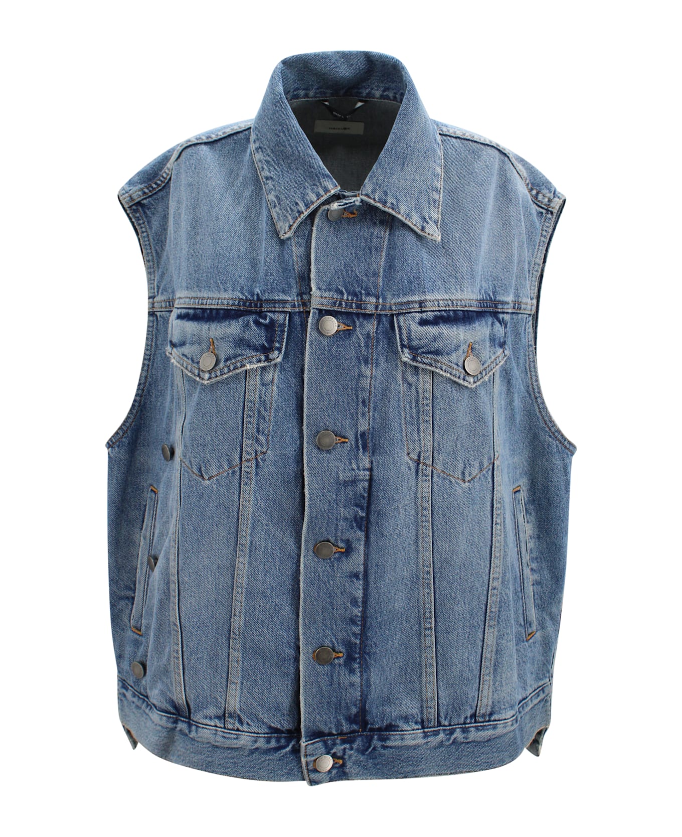 Vest crafted from light blue denim, featuring a clean and versatile design. The style includes a front button fastening, flap pockets, a side welt pocket, and a sleeveless silhouette. Silver-tone details add a modern finishing touch. Features Color: light blue Fabric: denim Sleeveless Front button fastening Flap pockets Side welt pocket Silver-tone details Origin: Italy