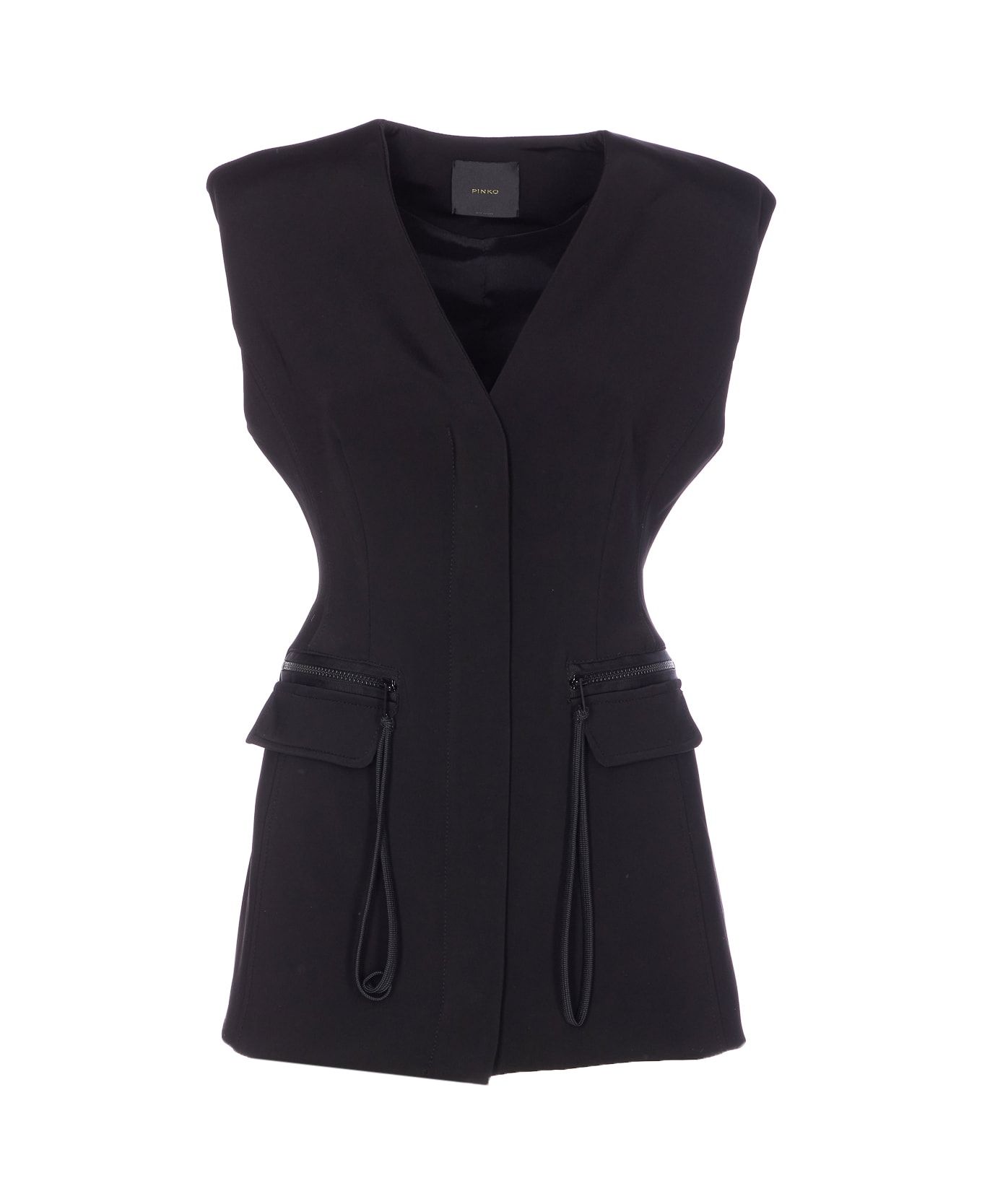 Pinko black Gitana vest with frontal zip and buttons closure, v-neck, sleveeles, reinforced shoulder, zip pockets Composition: 50% Viscose, 42% Nylon, 8% Elastane