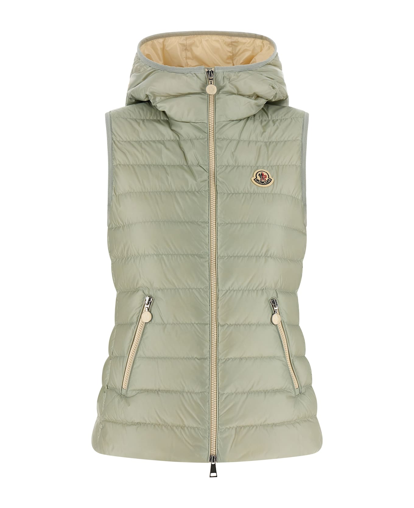 'Glygosse' quilted and goose feather padded vest in saison longue, hood, high neck, felt logo patch and front zip closure, pockets.