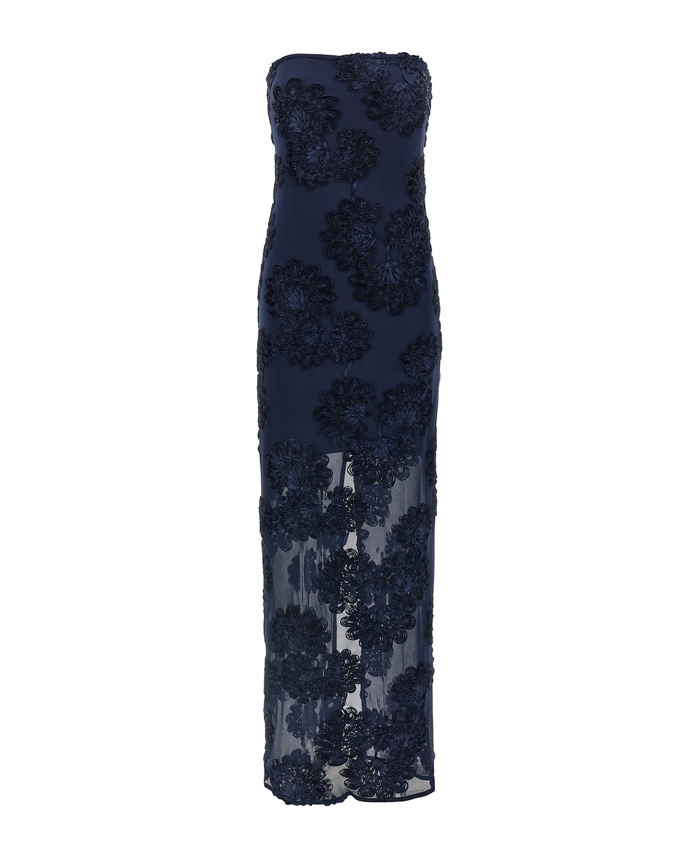 3D Mesh Maxi' semi-transparent mesh dress with all-over 3D floral appliqués, sleeveless off-the-shoulder style, inner band bra with back hook closure, lining, zip closure and back split. SUSTAINABLE: Product made from recycled polyester.