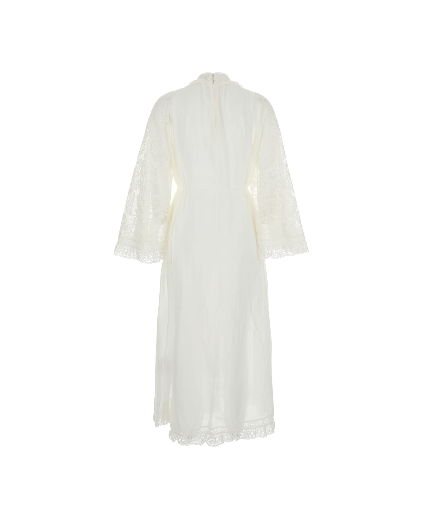 Midi dress White Stand-up collar Long wide sleeves Rear concealed zip closure Lace embellishment Lace hem Ramie Relaxed fit