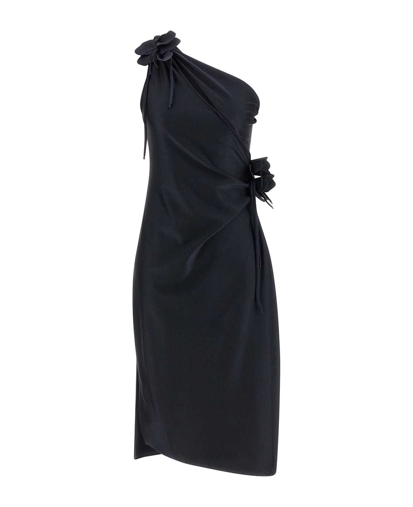 'Asymmetric Mini Flower' midi dress in stretch technical jersey, one-shoulder model, front cut-out detail, brand petal knots on the shoulders and waist, sleeveless, side split, asymmetrical hem.