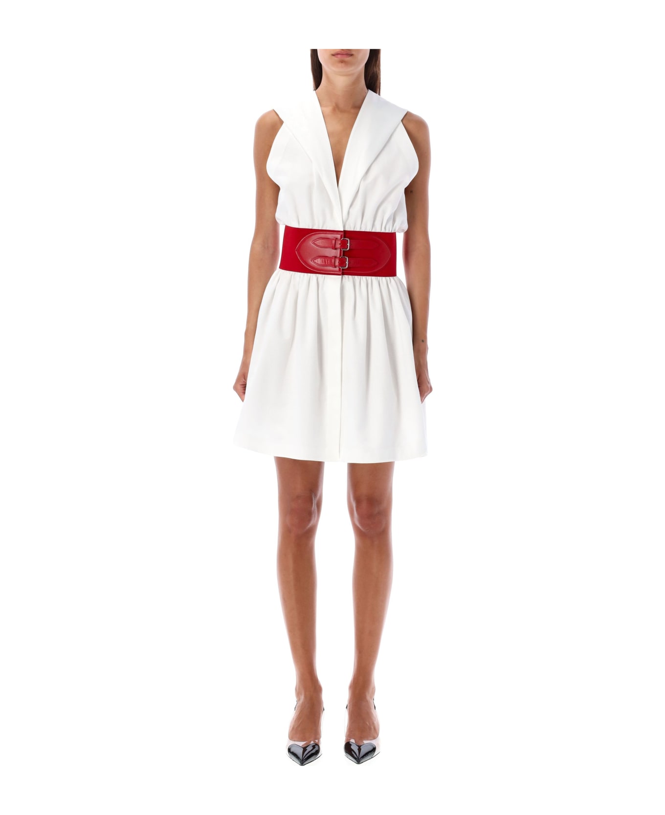 Belted Hooded Dress By Alaïa. Featuring: Mini Hooded Dress Sleeveless Integrated Red Elastic And Leather Belt Flared Skirt Made From Pique Cotton Fabric Model Is 1,72 M Tall And She Is Wearing Size 38