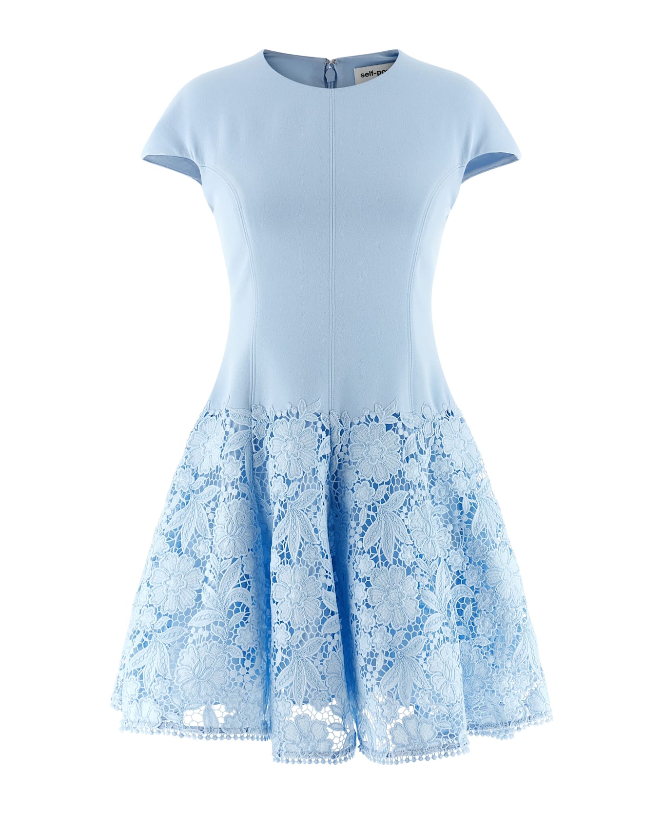 'Blue Crepe Lace' crepe de chine mini dress with perforated lace skirt insert with underskirt, crew neck model, back zip and hook closure, short sleeves.