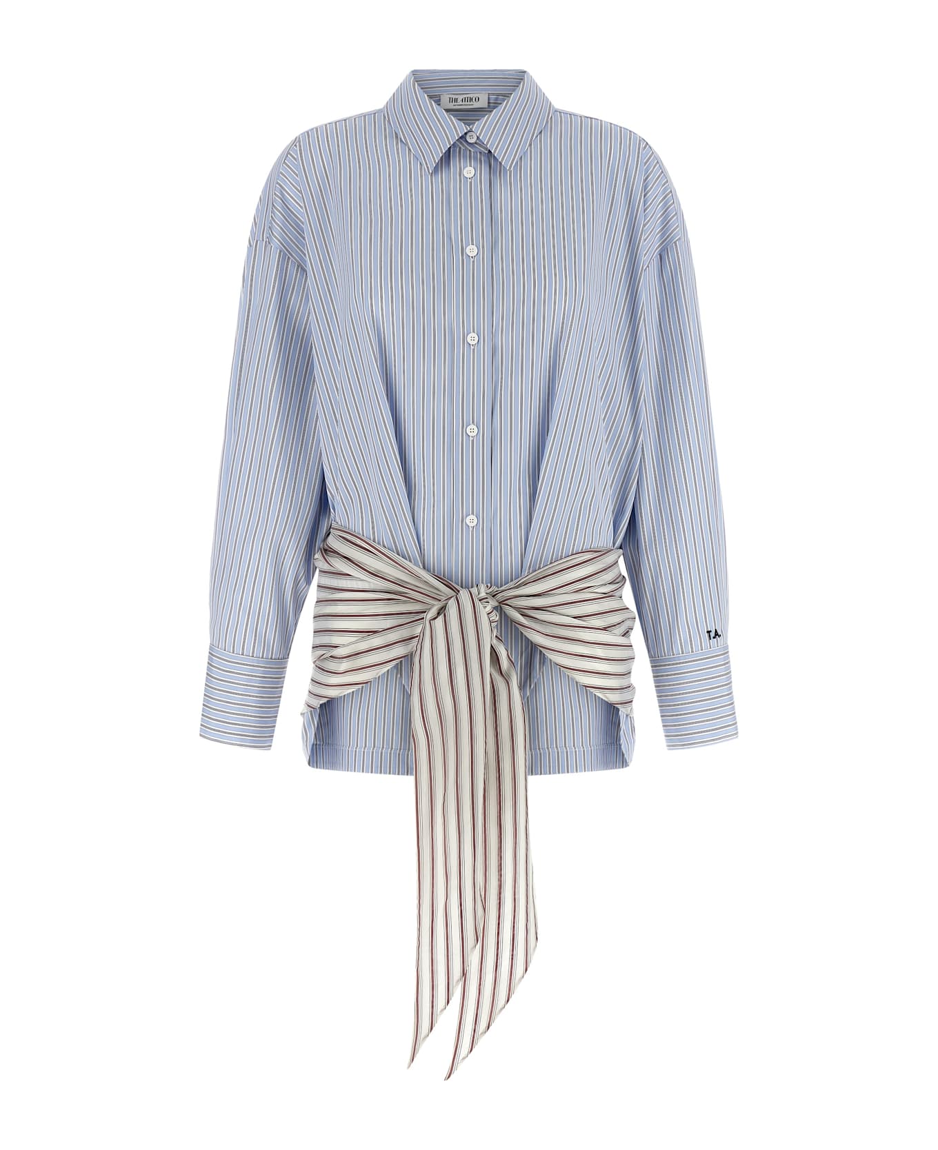 'Blue' shirt-style bodysuit in striped poplin with collar, front button closure, front poplin knot detail with contrast stripes, long sleeves with cuffs and cufflinks, initials embroidered logo. Composition: 100% cotton
