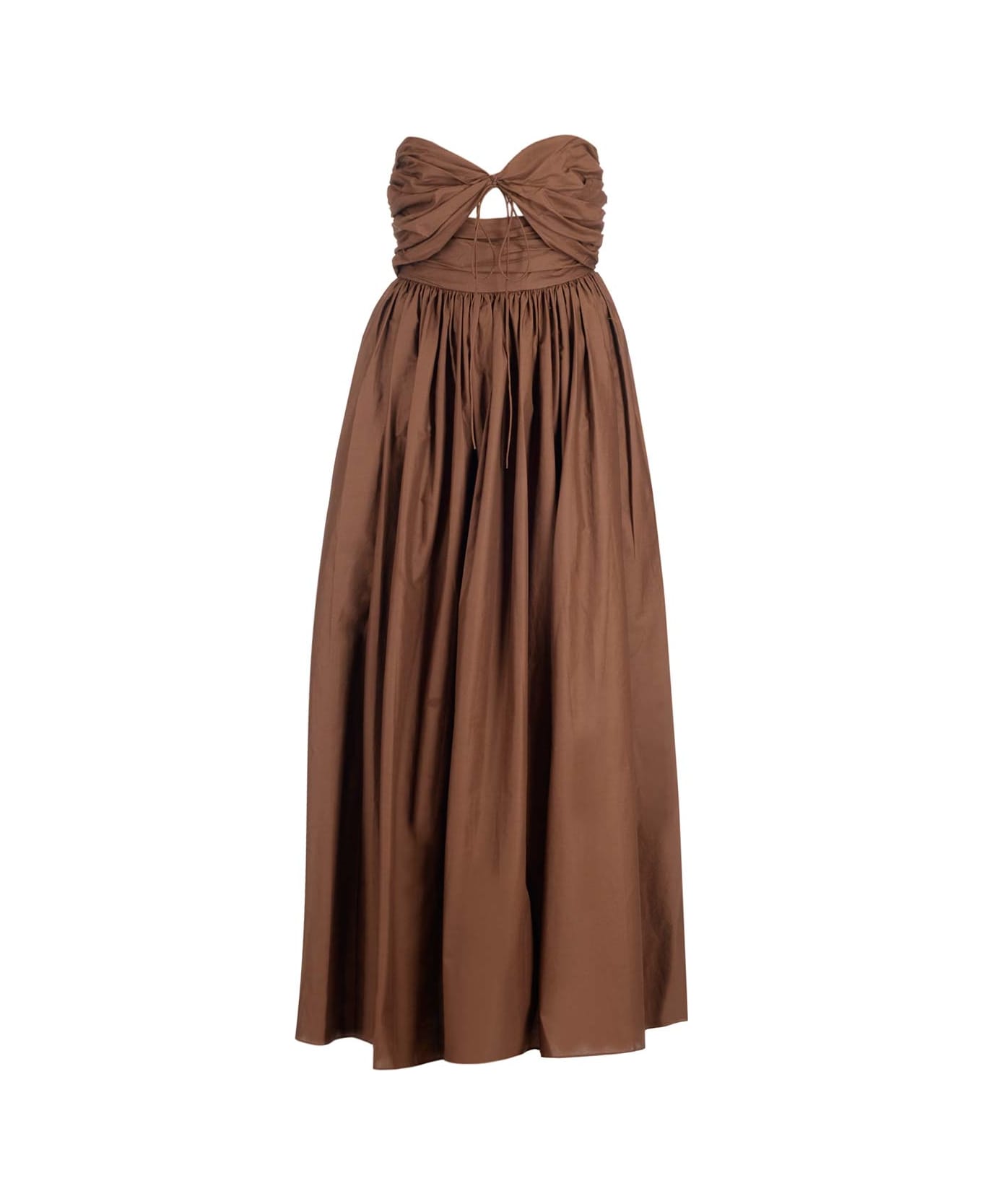 Cut-out maxi dress from Matteau in brown organic cotton, with gathered waist, bandeau-style top, ankle-length skirt.
