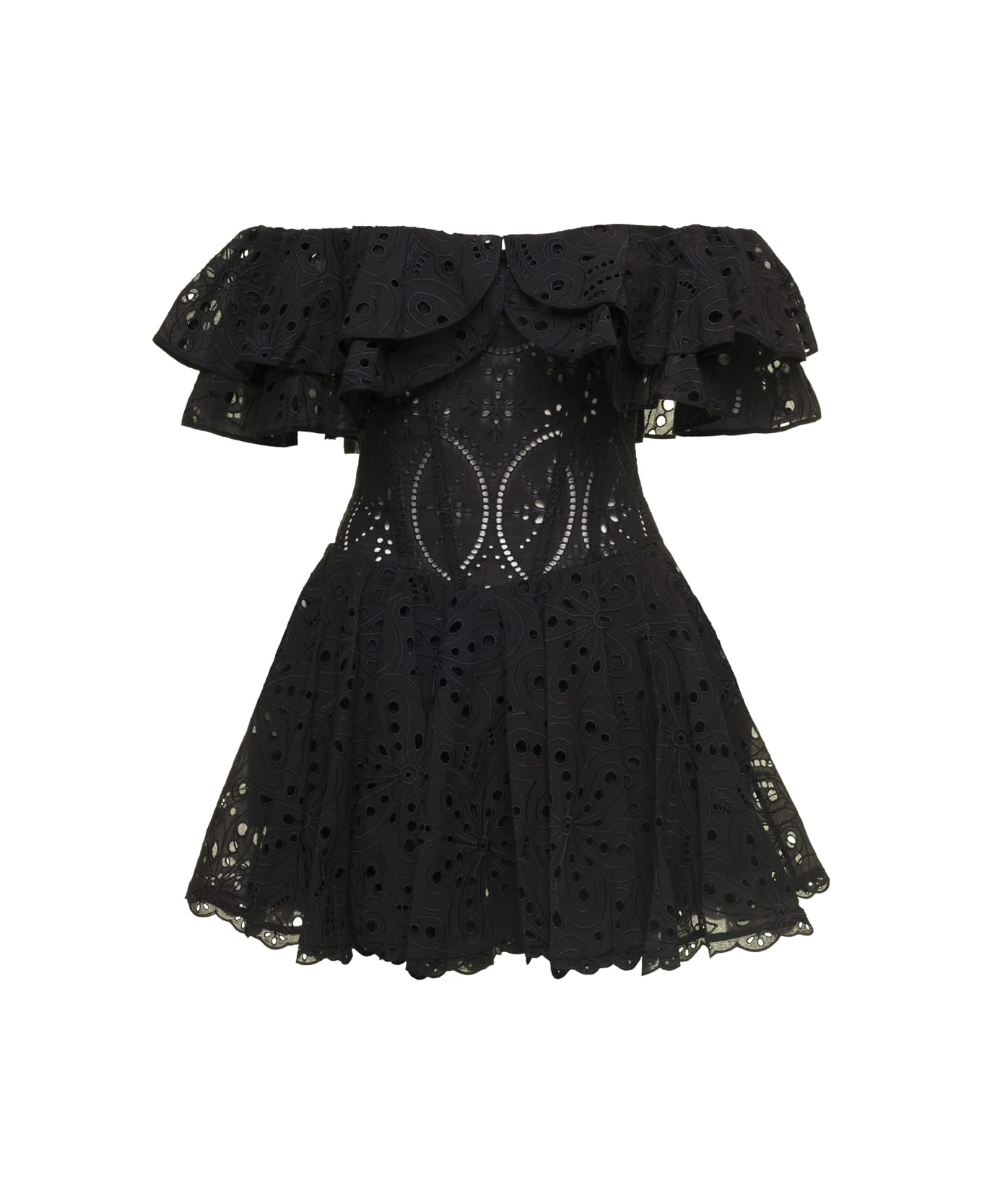 'dalia' Mini Black Dress With Bardot Neckline And Ruffles In Broderie Anglaise Cotton-blend Woman Charo Ruiz