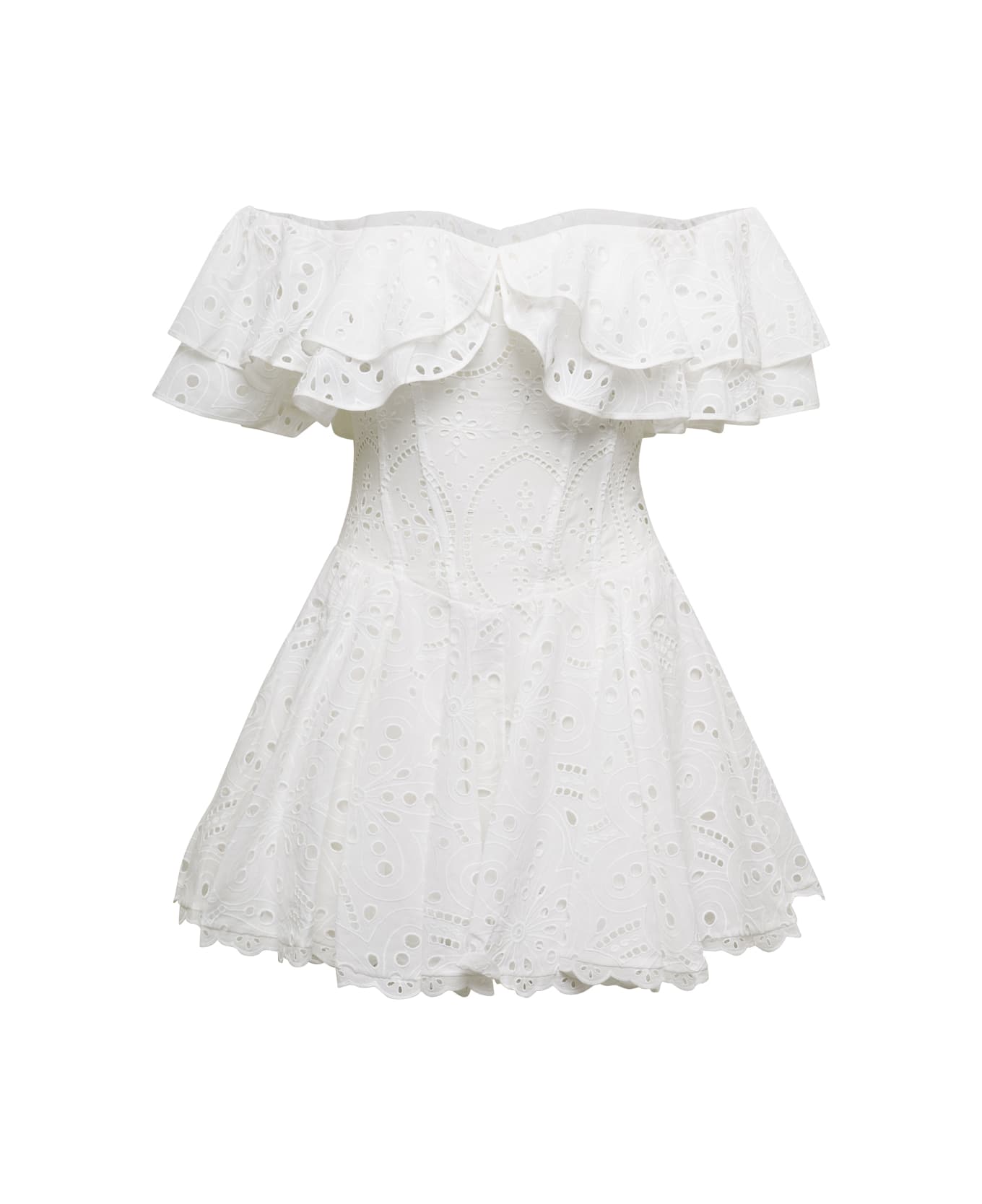 'dalia' Mini White Dress With Bardot Neckline And Ruffles In Broderie Anglaise Cotton-blend Woman Charo Ruiz