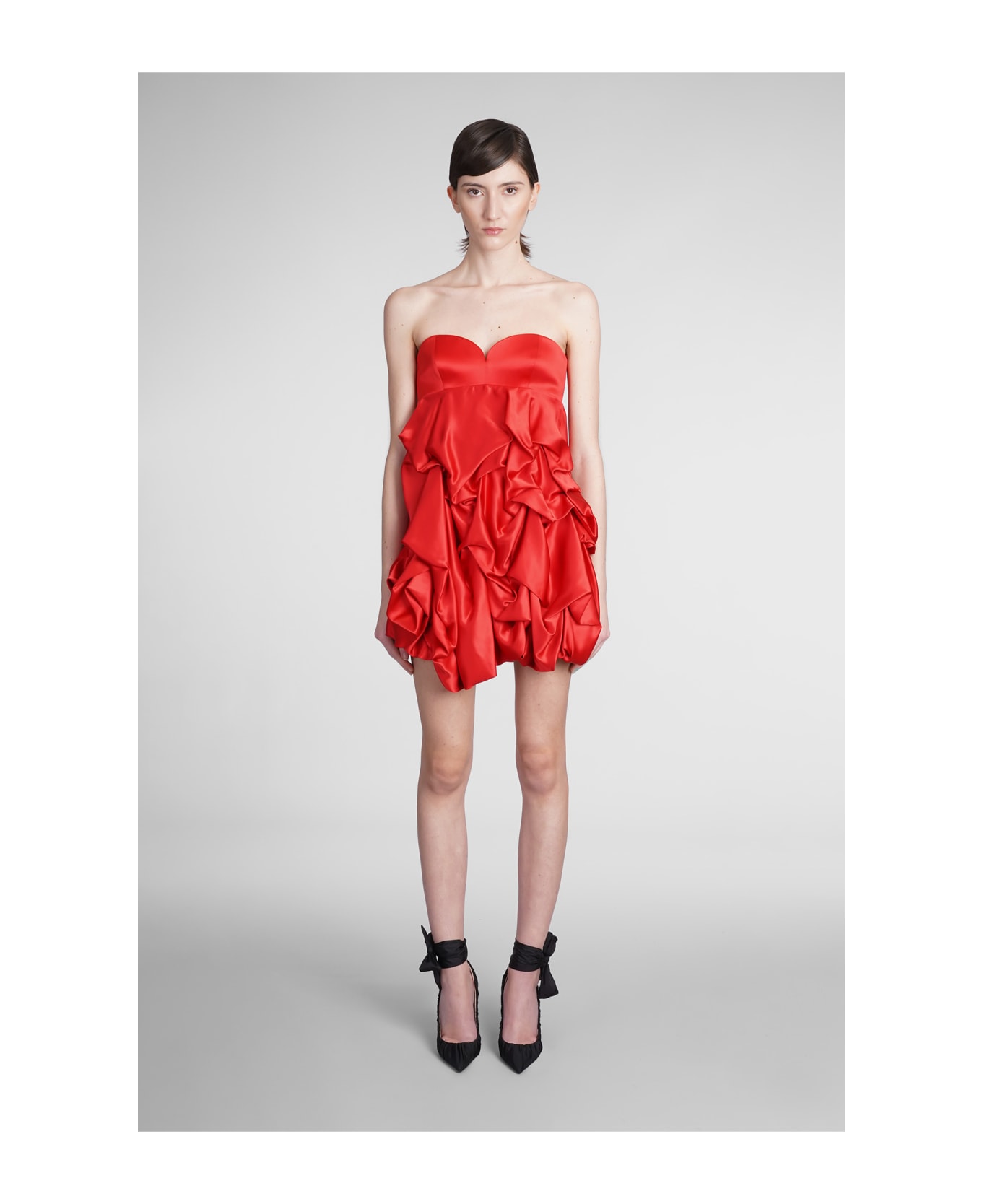 Dress in red silk, heart neck, gathered detailing, zip clousure, strapless, 100% silk, Made in Italy, model is 180 cm and wears size 40