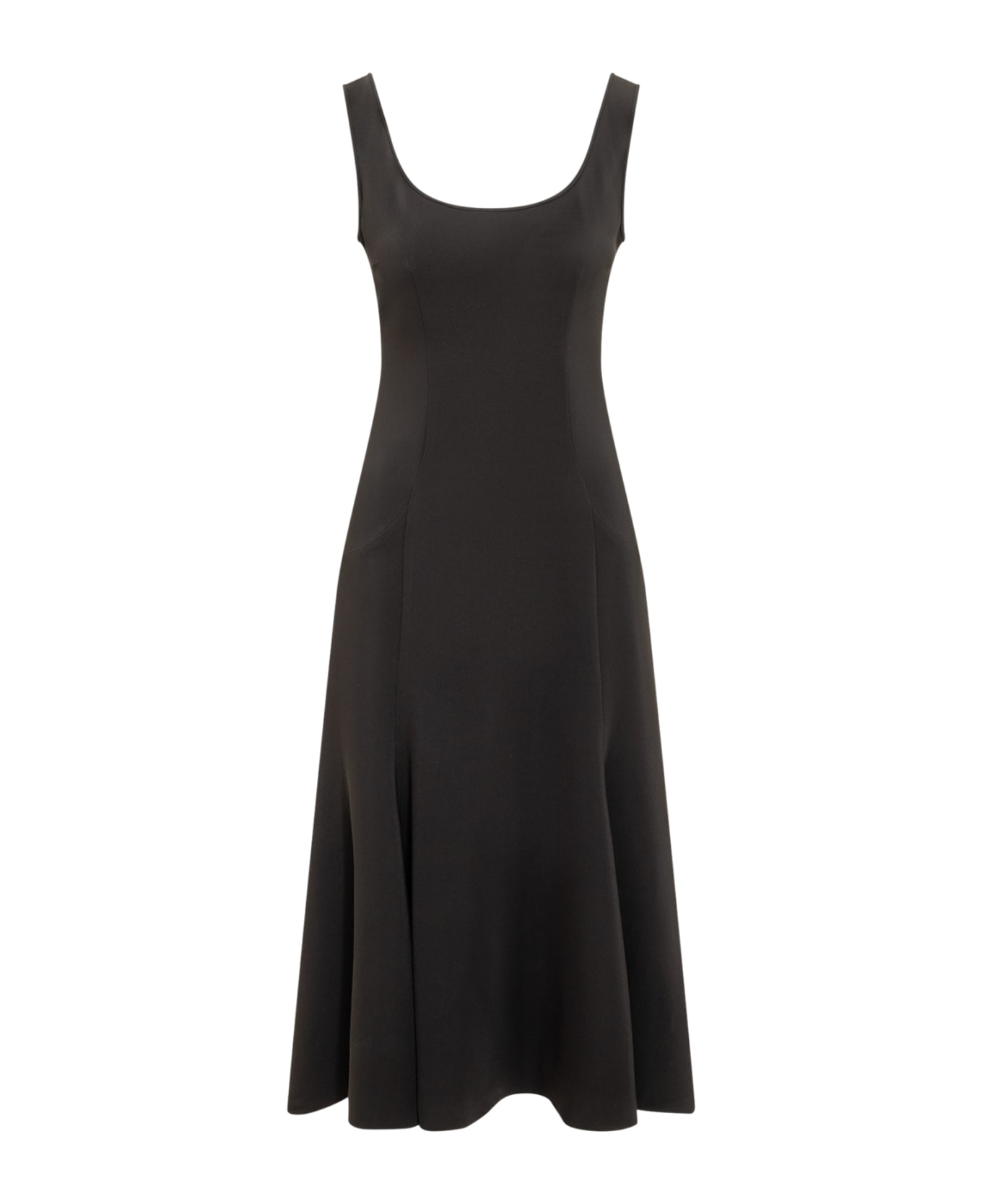 Black midi sleeveless dress. Round neckline. Zip back closure.