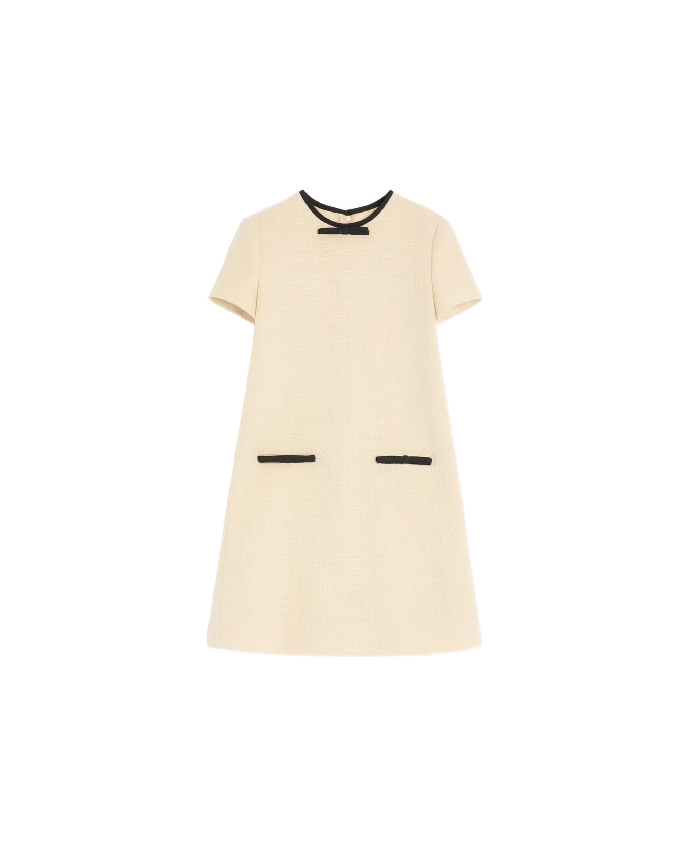 Valentino dress ivory wool tweed short sleeves bow neckline black contrast trim front pockets rear zipper and hook-and-eye closure The model is 176 cm / 5'9" tall and wears an Italian size 40 The full look includes Valentino Garavani accessories.