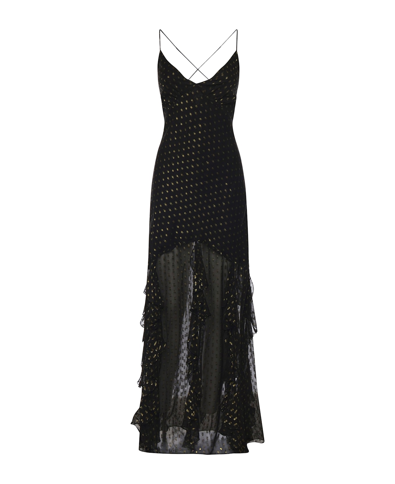 - Made of viscose - Waterfall skirt with ruffles - Open back with ties - Adjustable shoulder straps - Size shown is XS - Color: Black