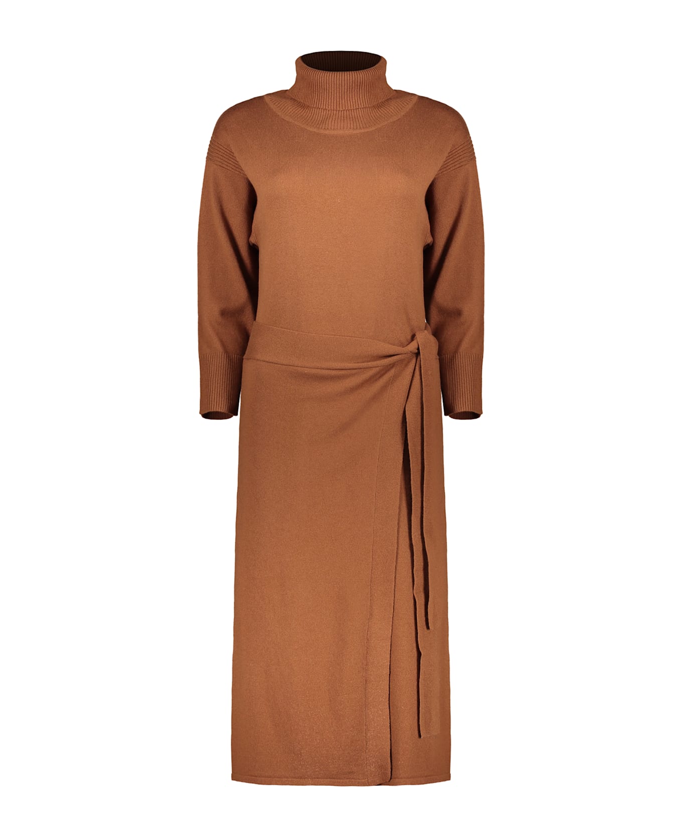 Midi dress with a fluid silhouette, characterized by a high collar and long sleeves. made from an elegant soft fabric, it offers a perfect balance between comfort and style. it features gathered details on one side, giving movement to the garment. the warm and enveloping tone adds a touch of sophistication, making it ideal for various occasions. the comfortable fit allows for easy freedom of movement. perfect to pair with minimalist accessories for a refined look.