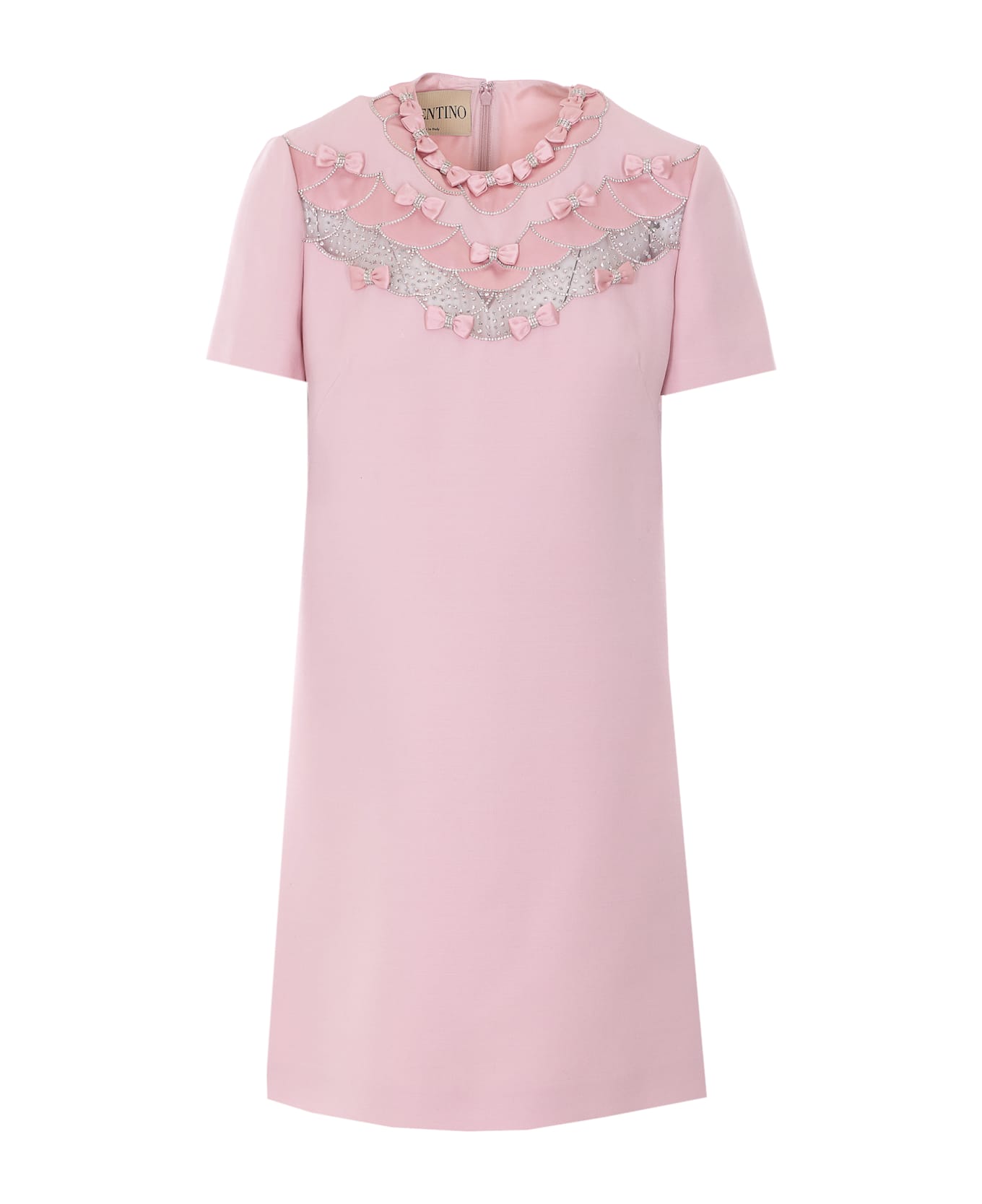 Valentino Garavani pink mini dres, crewneck, zip and hook closure on the back, short slevees, application bow detail on the front, solid fit Composition: 65% Virgin Wool, 35% Silk, 100% Silk, 100% Polyester, 100% Silk