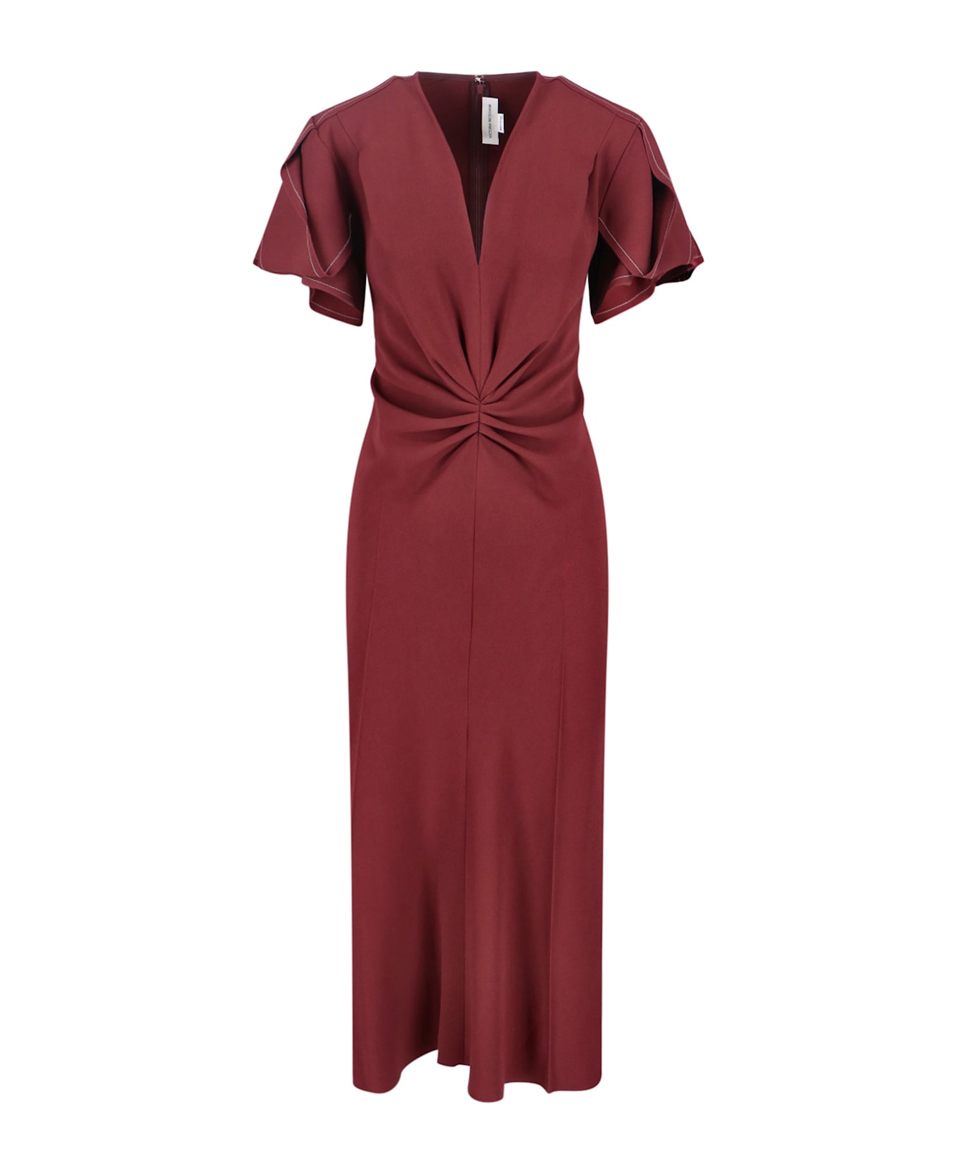Victoria Beckham 'EVE' midi dress in burgundy red viscose blend with short sleeves, V-neck, back zip closure, front and back draping detail, contrast stitching, straight hem.