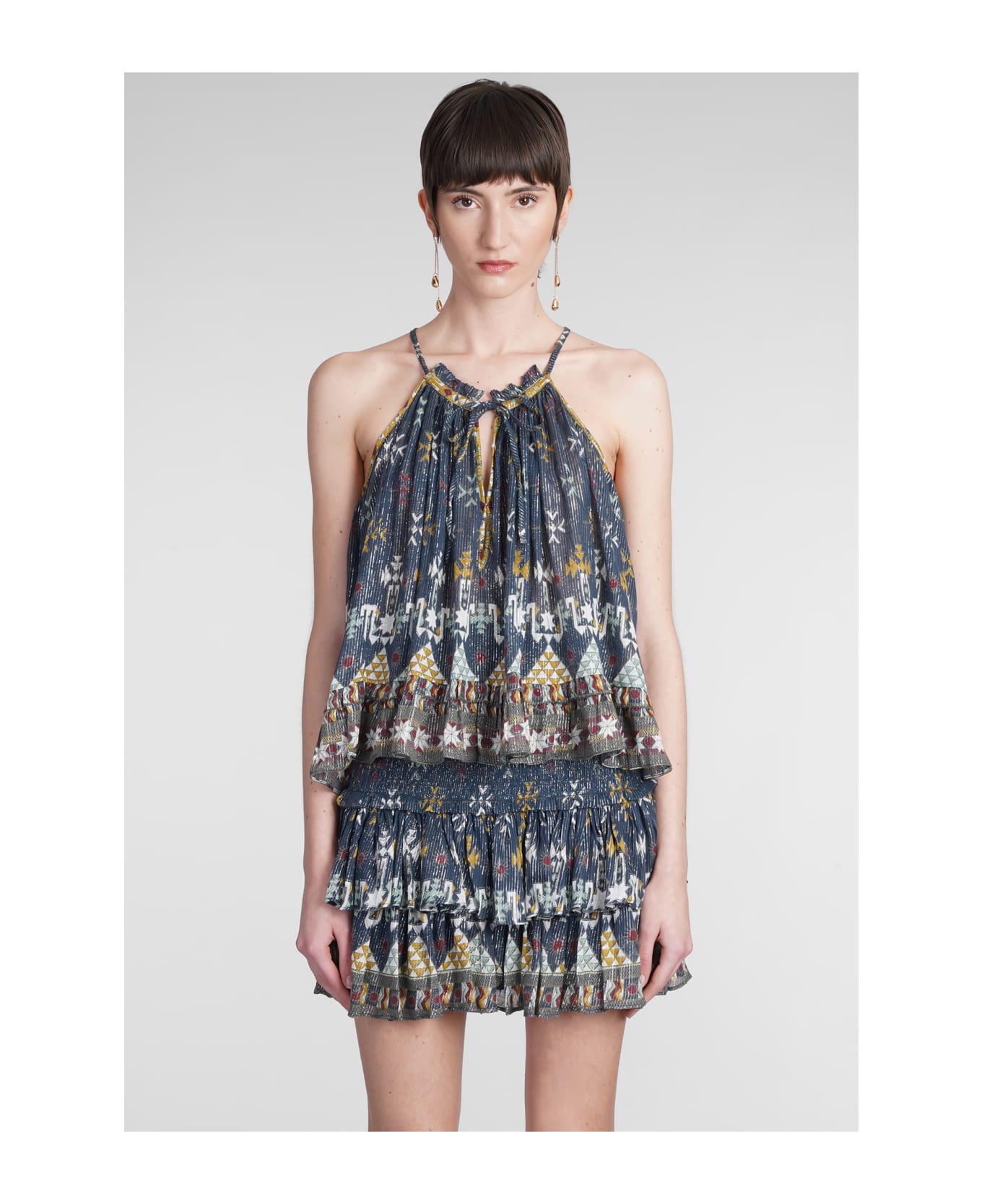 Fabino Topwear in blue cotton, ruffles, laces detail, ethnic style, sleeveless, lurex details, 99% cotton, 1% polyester, Made in India, Model is 180 cm and wears size 34