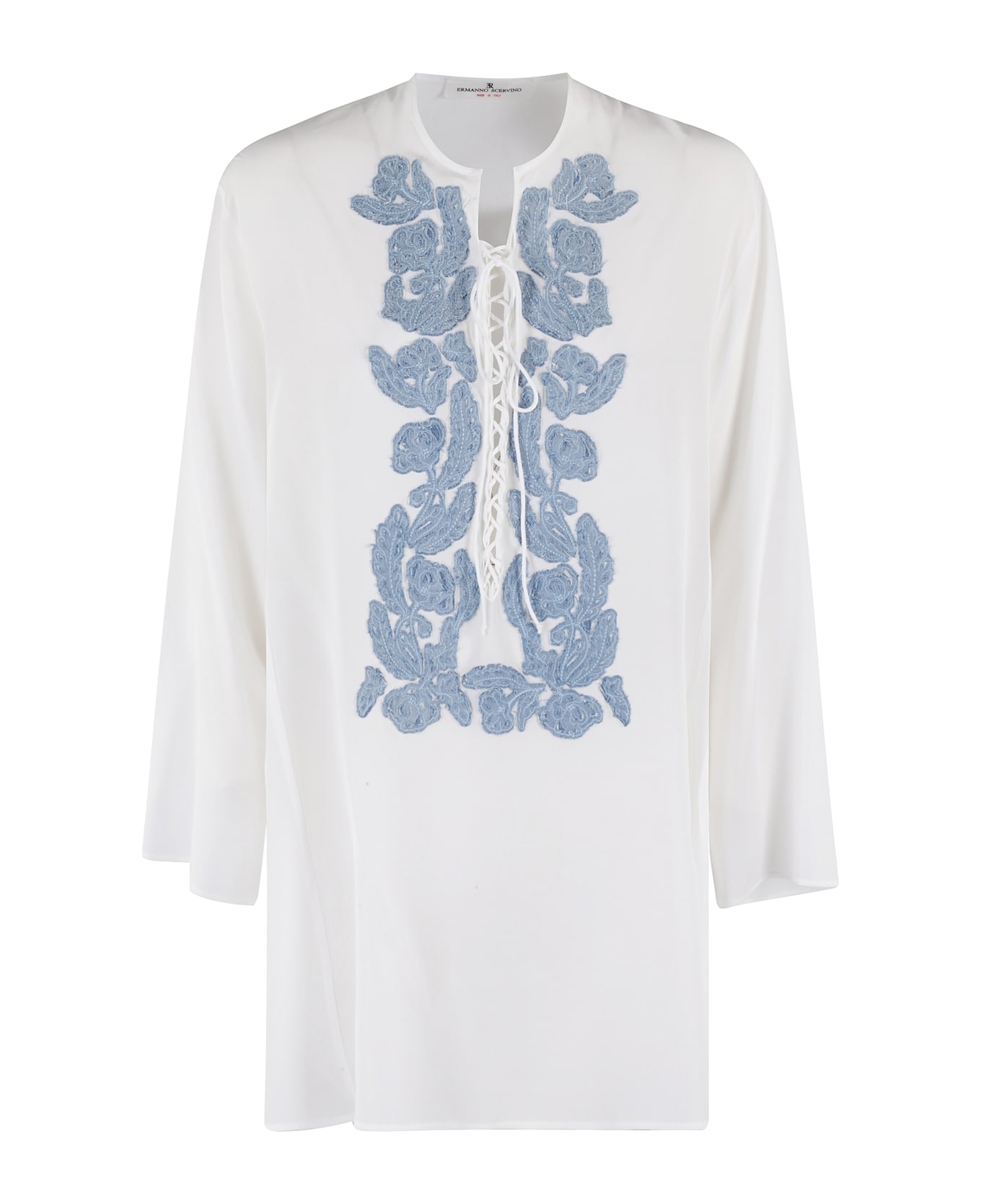 Ermanno Scervino Silk Blouse White color Long sleeve Front floral embroidery Over pattern Front tie closure