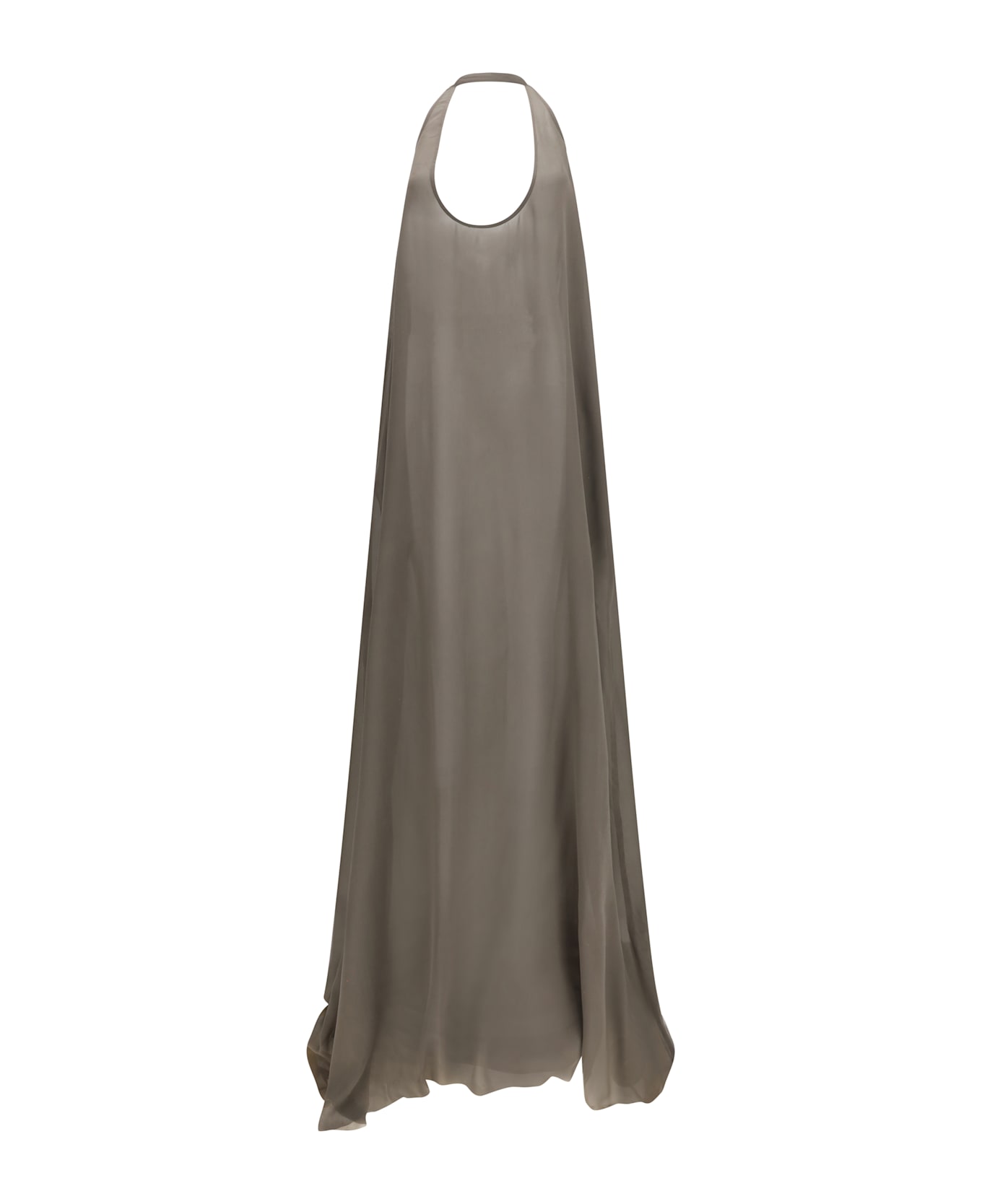The haltar silk georgette dress by rick owens stands out for a streamlined floor-length silhouette that reflects the brand s radical elegance. the dress model by rick owens is crafted from lightweight silk georgette and features slender straps and a subtle racerback that define the structure of the garment. a signature seam along the center back introduces a discreet architectural detail. the rick owens haltar gown completes the design with a minimalist and sophisticated style.