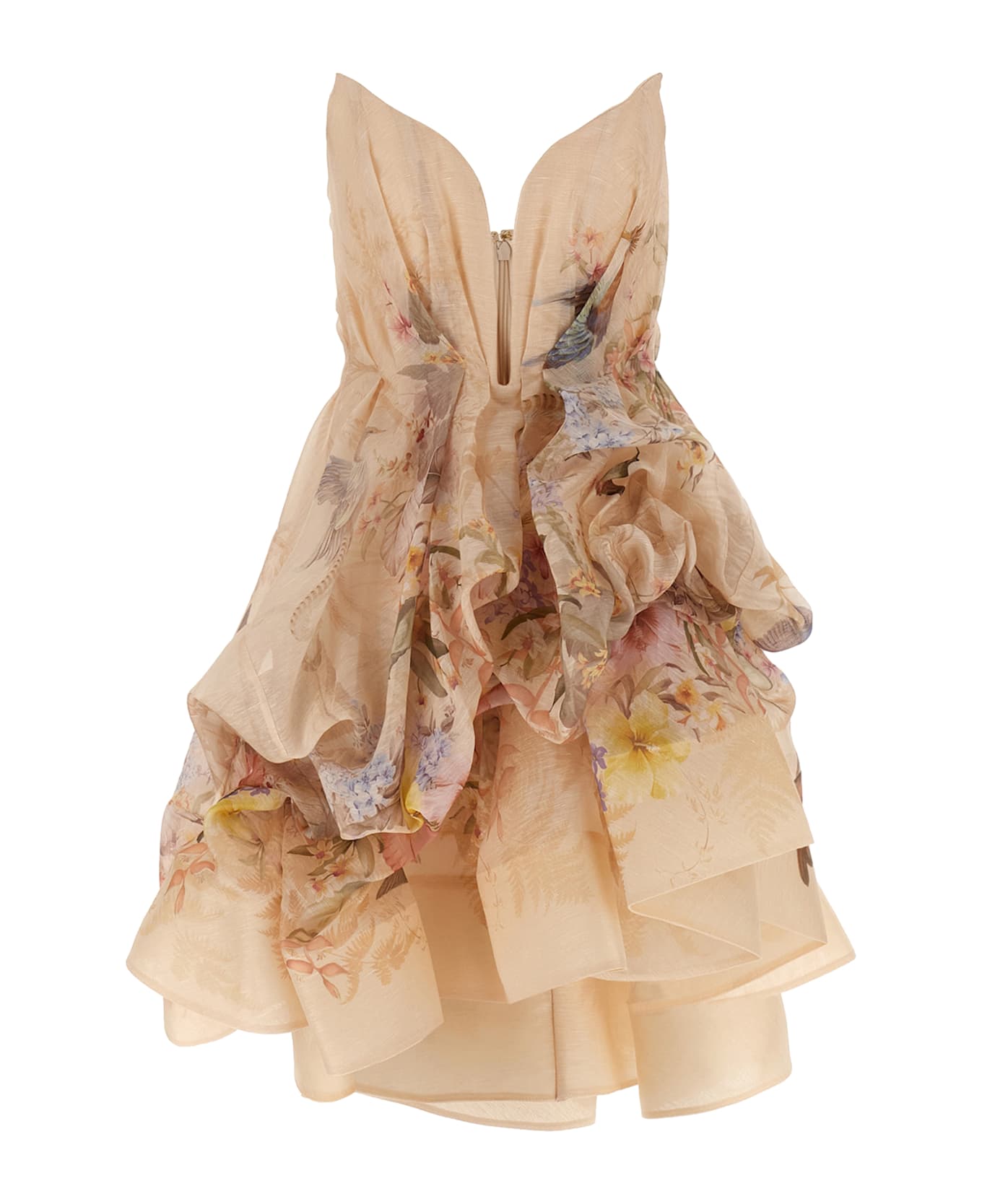 'Illuminate Draped Mini' off-the-shoulder dress in silk and linen with slats, deep plunge neckline, asymmetrical hem, layered skirt with draping, back zip closure. Composition: 52% linen, 48% silk