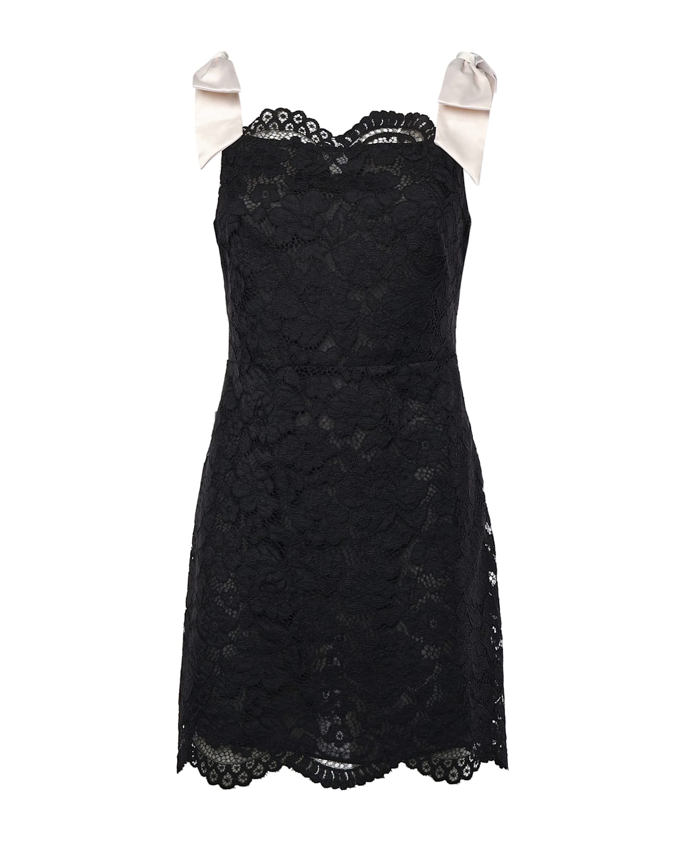 -Made of lace -Side zip closure -V-neck at the back -Scalloped edges -Lined -Size shown is XS -Color: Black