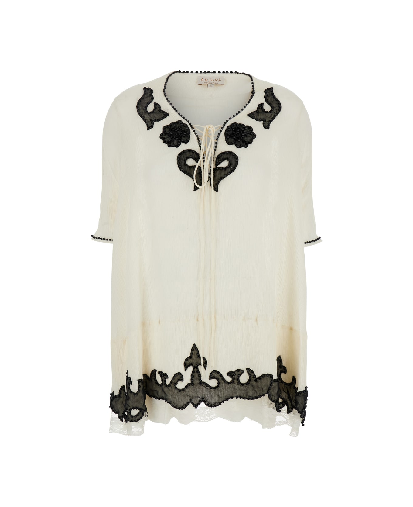 Dress White Wide neckline on the front Short sleeves Front fastening with tie drawstring Black contrast details Applique beads Asymmetric hem Fabric Relaxed fit