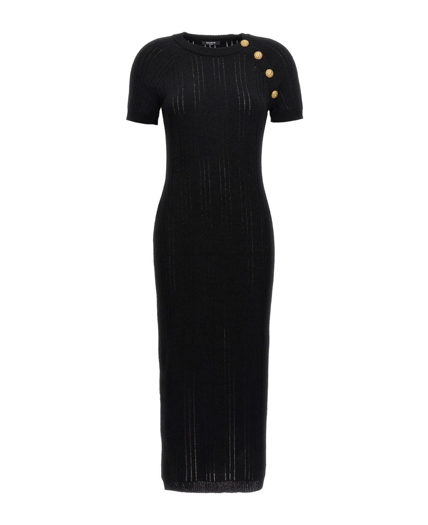Long cotton blend knit dress with gold button appliqués, a crewneck, and short sleeves. Composition: 54% cotton 46% nylon