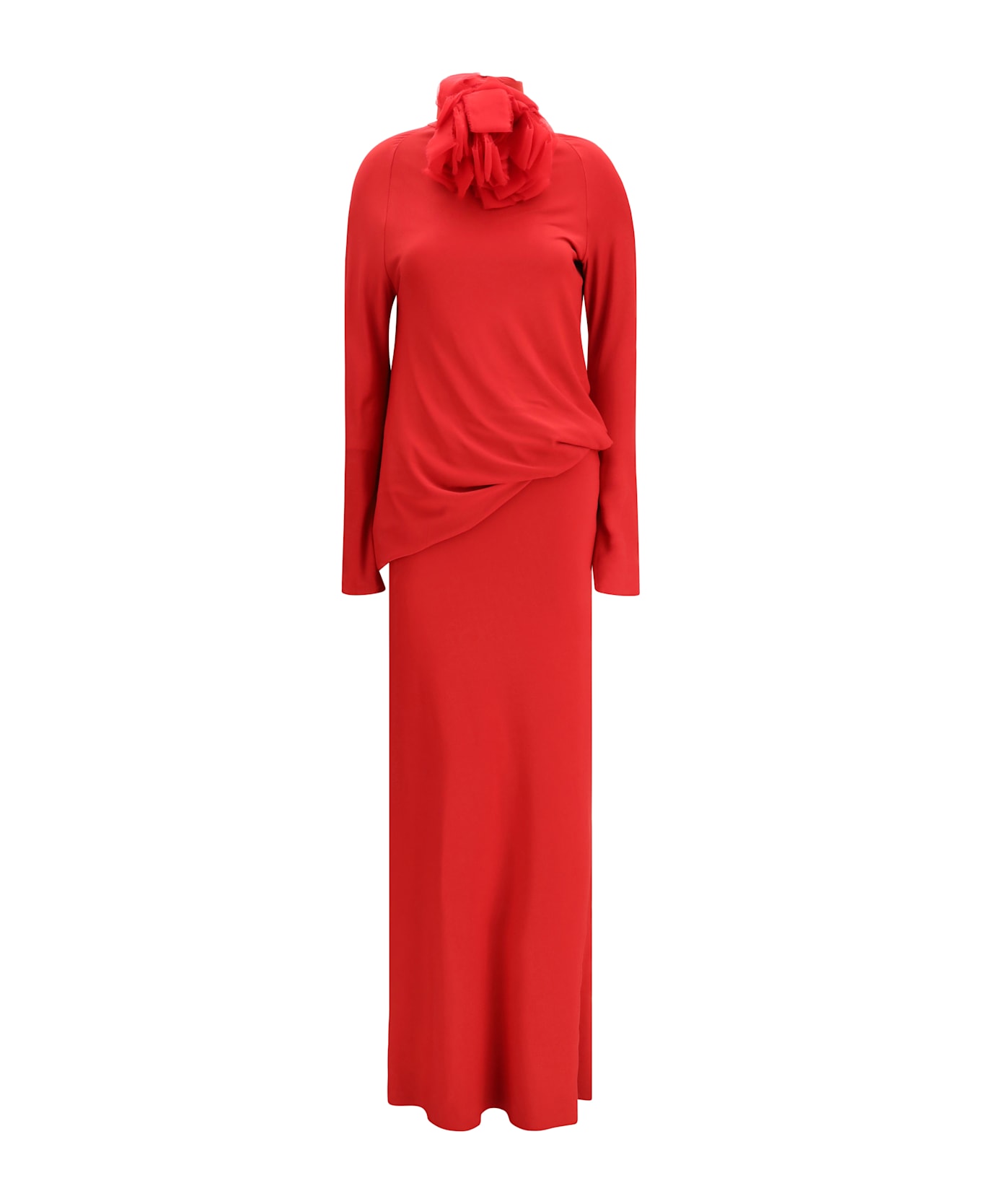The long open-back dress with high neck embodies understated sophistication, crafted from soft viscose-silk jersey with a hint of stretch. long raglan sleeves and a draped blouson-style top contrast elegantly with the fluid, body-skimming skirt. the front is defined by a modest high collar, while the back reveals an open design that creates a striking, unexpected effect. the collar fastens at the back with five buttons, and a detachable floral brooch adds a refined, feminine accent that can be styled as desired.
