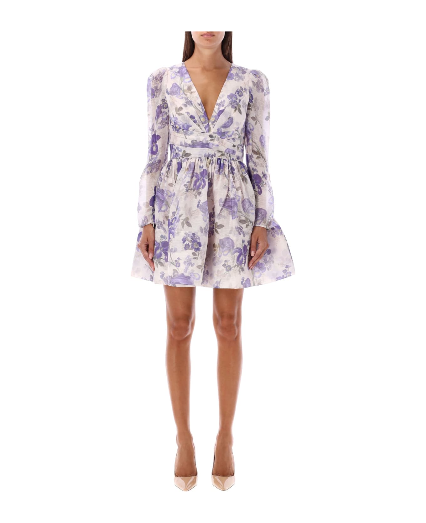 Lyrical Iris Print Mini Dress By Zimmermann. Featuring: V-neck Long Sleeves Zipped Cuffs Ripples At Waist Flared Skirt Rear Zip Closure Reinforced Hem Floral Print Pattern Model Is 1,72 M Tall And She Is Wearing Size 1