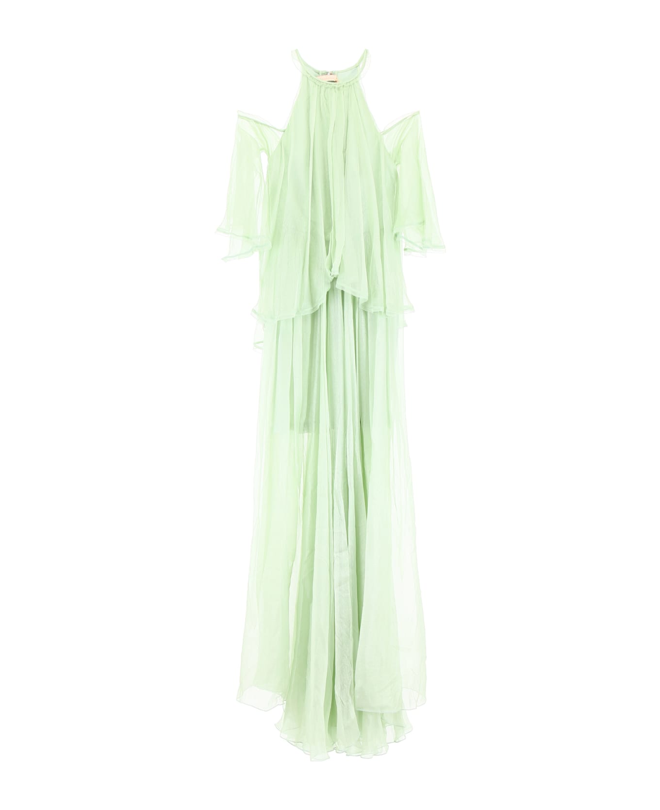 Maria Lucia Hohan silk muslin dress with halterneck and cut-out shoulders. It features back zip closure, ruffled top and partial lining. Model height is 177 cm and she is wearing a size FR 36.