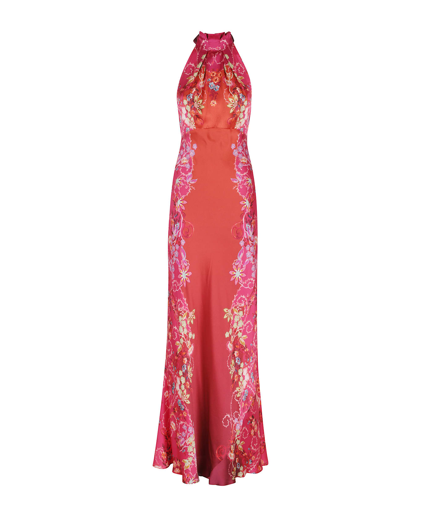 Category: Dress Item: Michelle Brand: Saloni Color: Red with floral print Neckline: Halter with ruffle Details: Bow on back neck SIZE AND FIT Fit: fitted Fit: slim Fit: flared at the bottom Length: to the toe