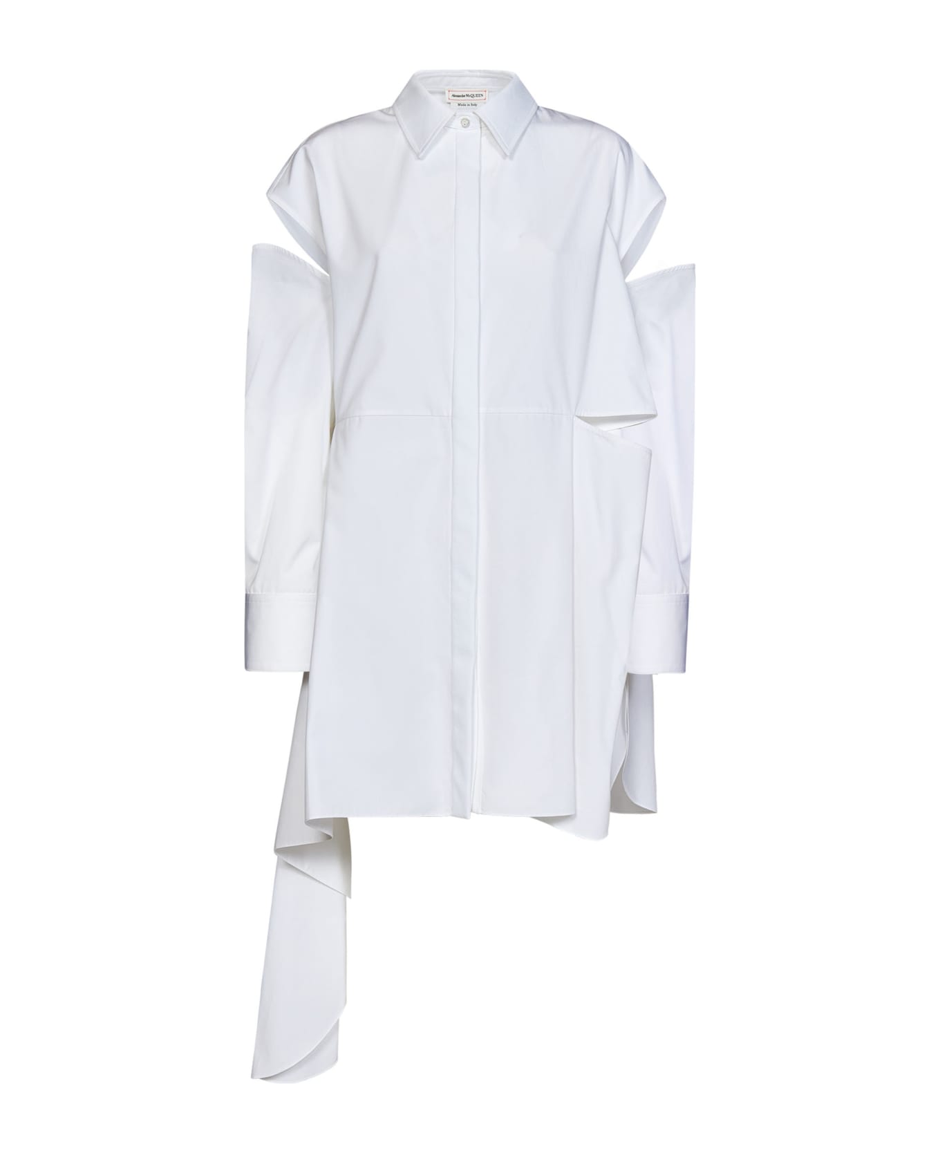 • Pointed collar; Long sleeves, cut-out details at armholes, one-button cuffs