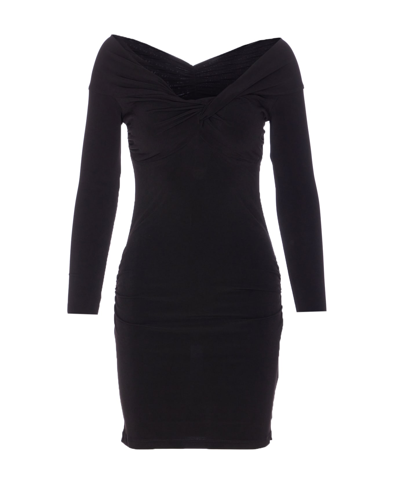 Patrizia Pepe black dress, tight fit, wide neckline, plaque logo, long sleeves, mini model