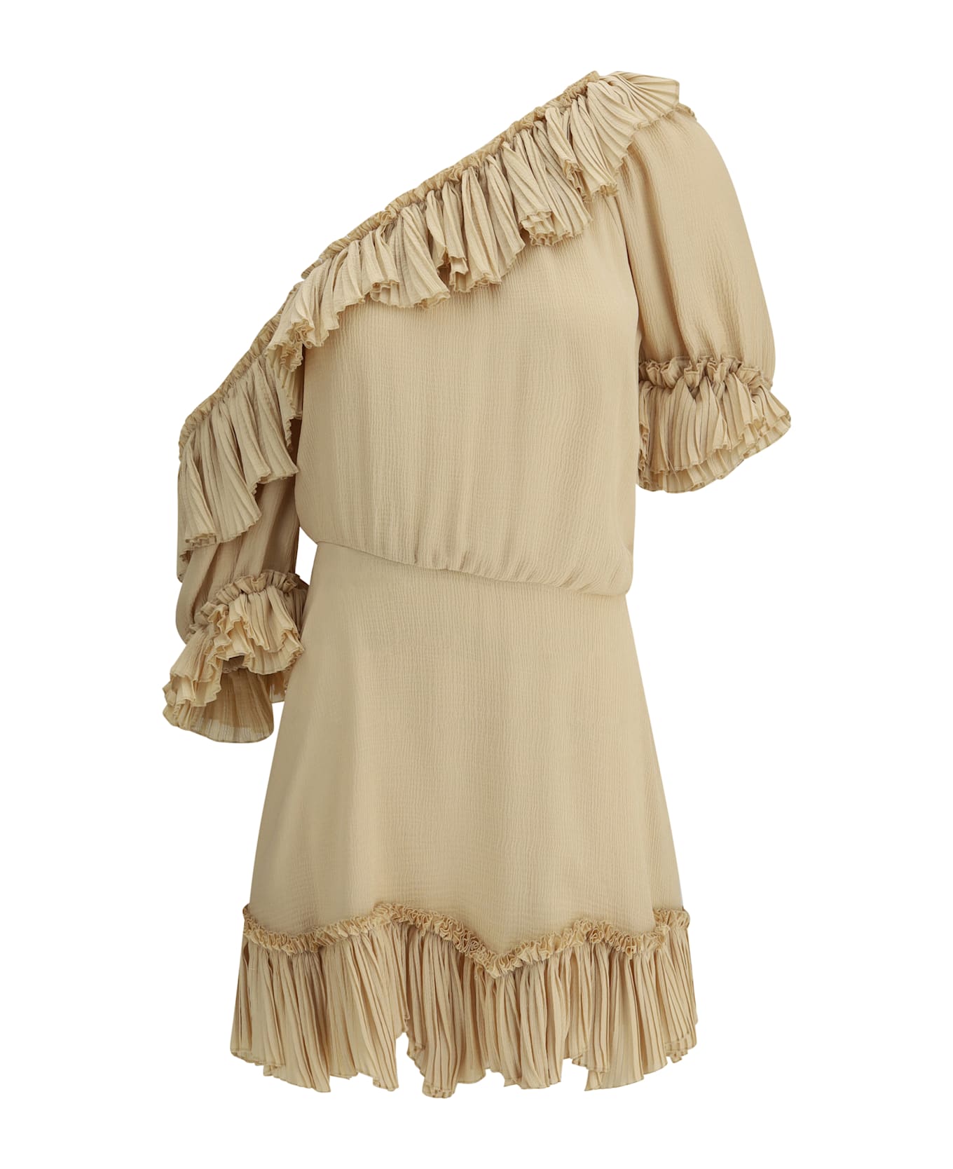 The saint laurent one-shoulder silk dress is a masterpiece of elegance and originality. the asymmetric silhouette, with a single exposed shoulder, gives a bold and sophisticated touch, while the short poet sleeves, enriched by a flounced pleat finish, add volume and movement. the side zip closure ensures a perfect fit. this dress combines the luxury of silk with a modern and feminine design, perfect for special evenings or elegant events, where comfort merges with a timeless style.