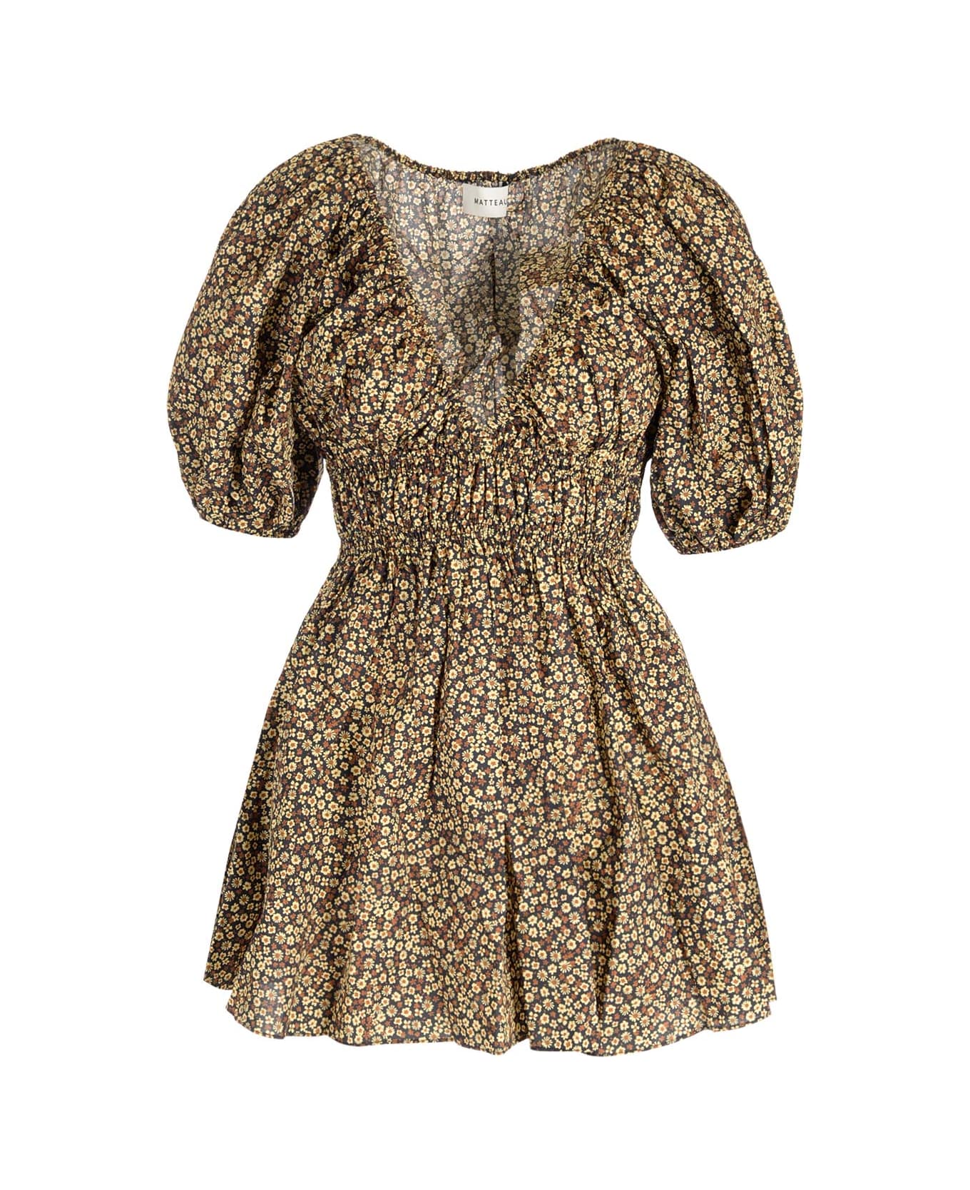 Mini dress from Matteu in yellow floral organic cotton with balloon sleeves and a plunging V-neckline