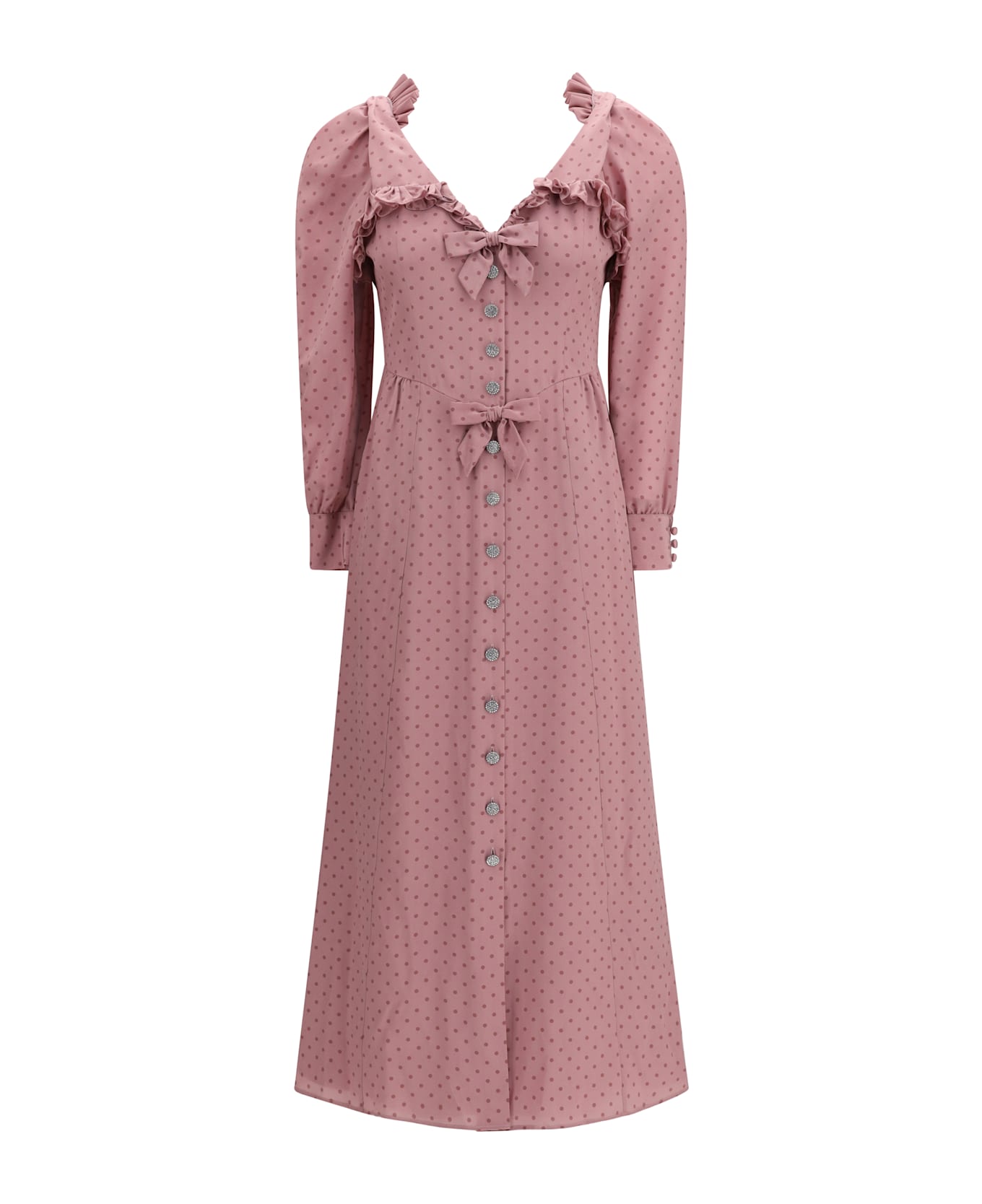 The polka dot midi dress with ruffles in silk by alessandra rich embodies romantic elegance with a retro-inspired appeal. featuring a v-neckline and bow detail, it is finished with decorative buttons and ruffle trims that enhance movement and femininity. the polka dot print adds iconic charm, making this alessandra rich dress a refined and distinctive statement piece.