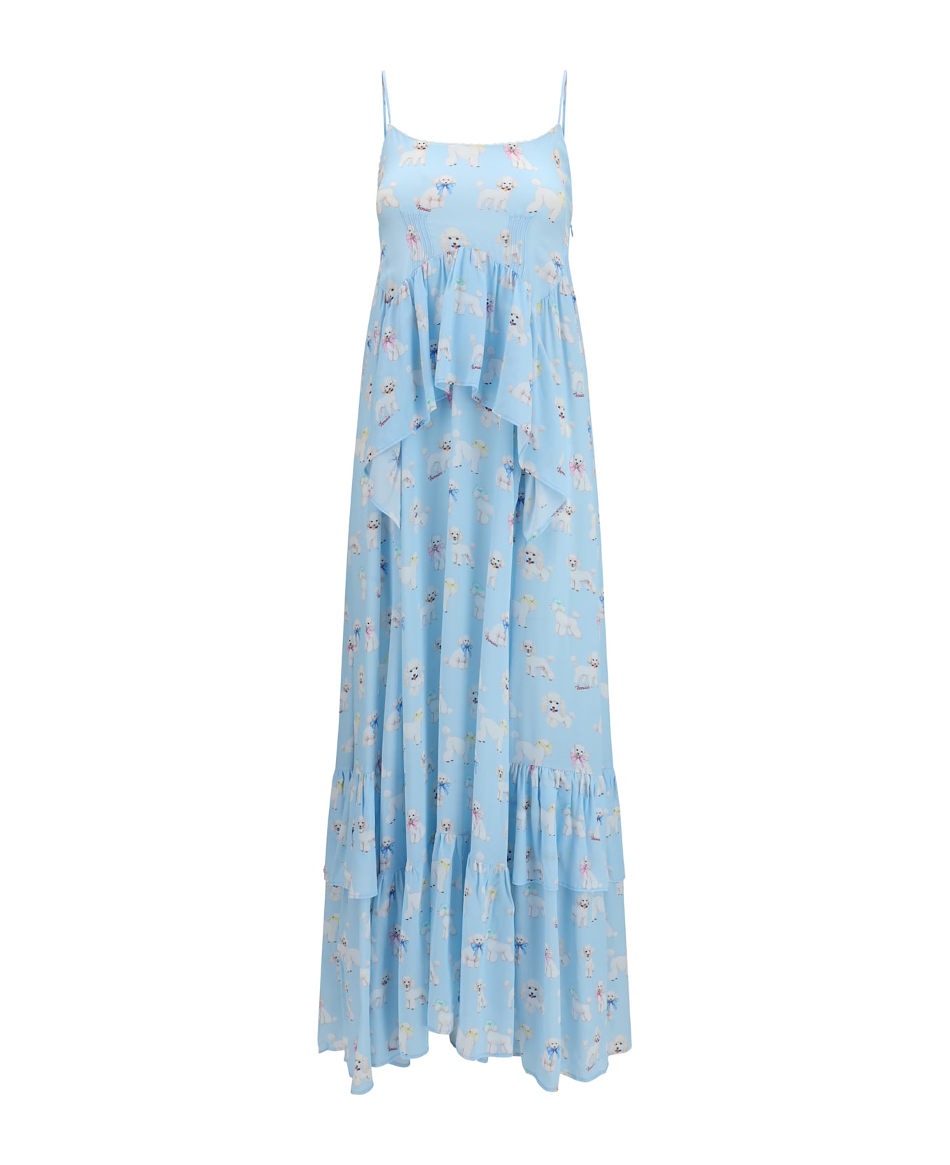 The poodle-print tiered maxi dress by fiorucci stands out for its playful and iconic aesthetic. made in italy, it features a relaxed fit with tiered layers starting just below the top, creating movement and lightness throughout the silhouette. the thin adjustable straps add both functionality and delicacy to the design. the all-over archival poodle print signs the piece with a distinctive character, making it perfect for fresh and eye-catching summer looks.
