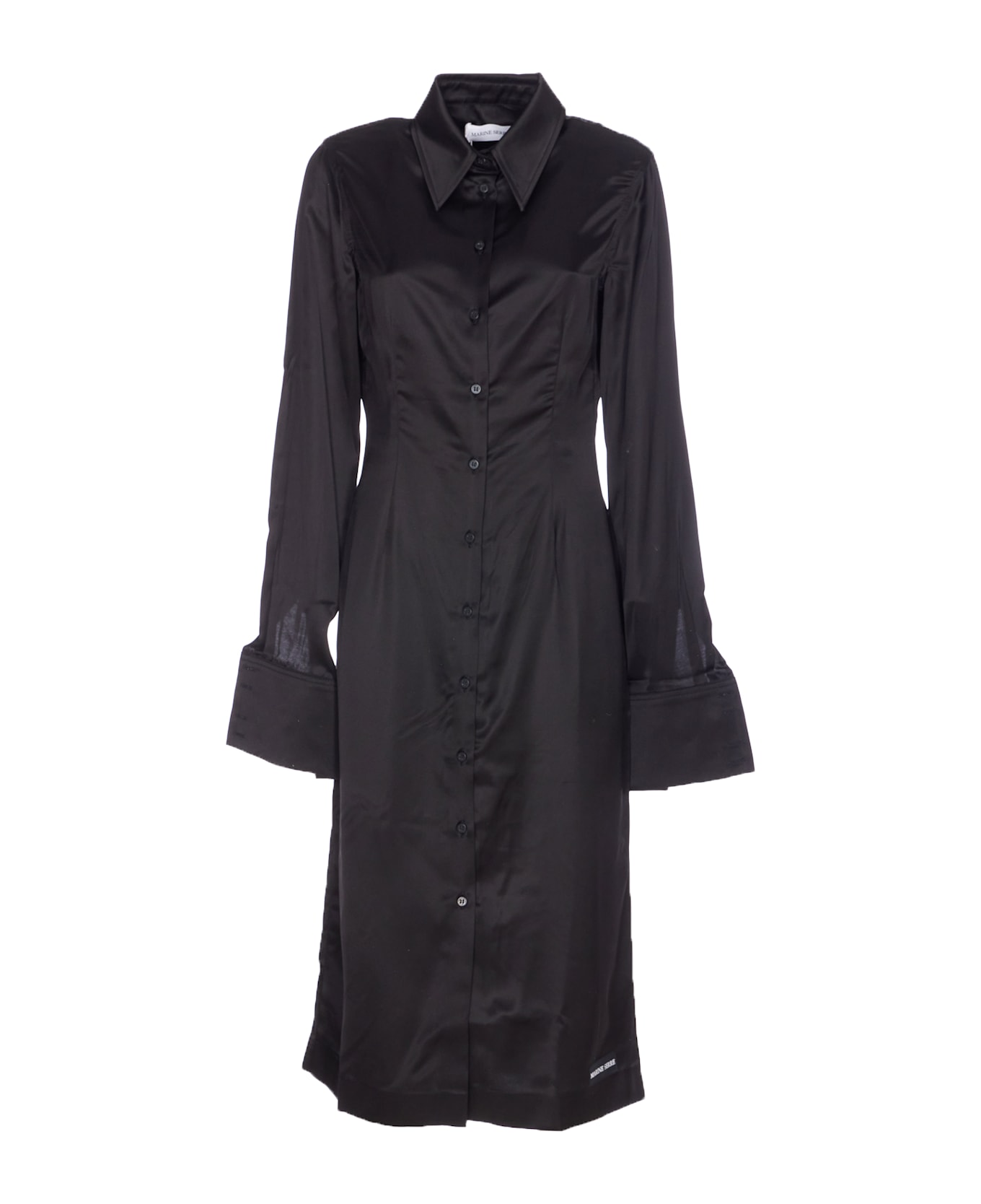 Marine Serre black satin wrapped dress, buttons closure, regular collar, long sleeves, button on cuffs
