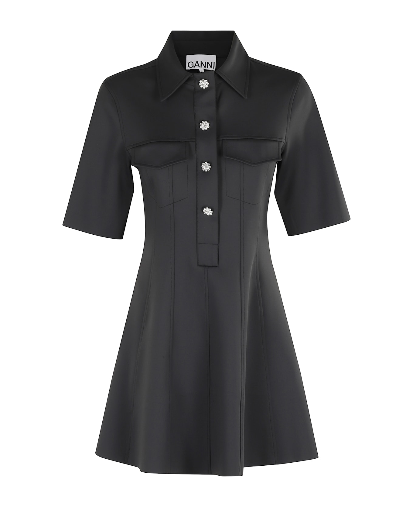 Neoprene mini dress -Ganni -Phantom color -Short sleeve -Center closure with jewel button -Front pockets
