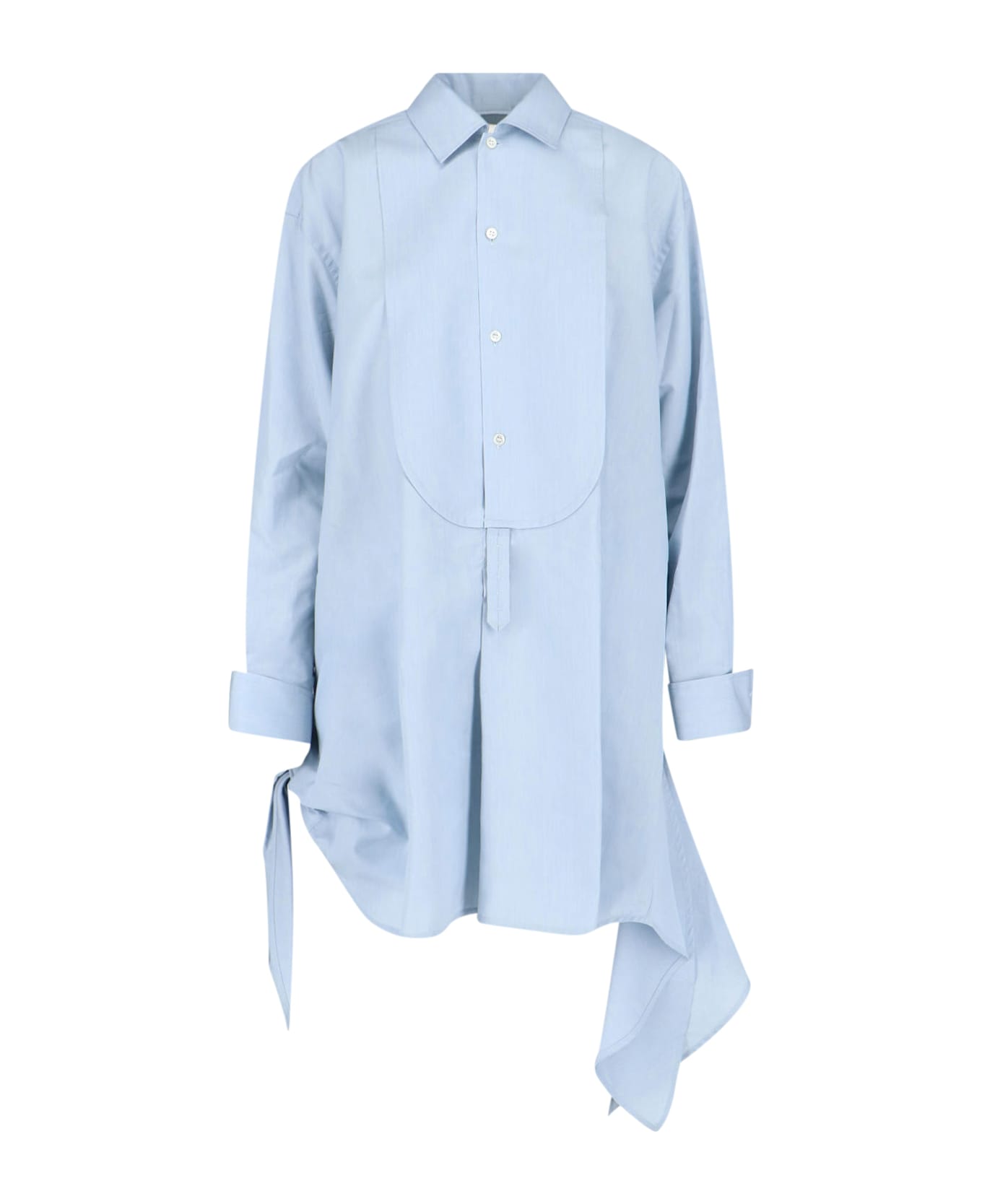 J. W. Anderson shirt dress, made of a blue cotton-silk blend, classic collar, button closure, tone-on-tone 'Anchor' embroidery detail, side knot detail, cuff buttons, asymmetrical hem.