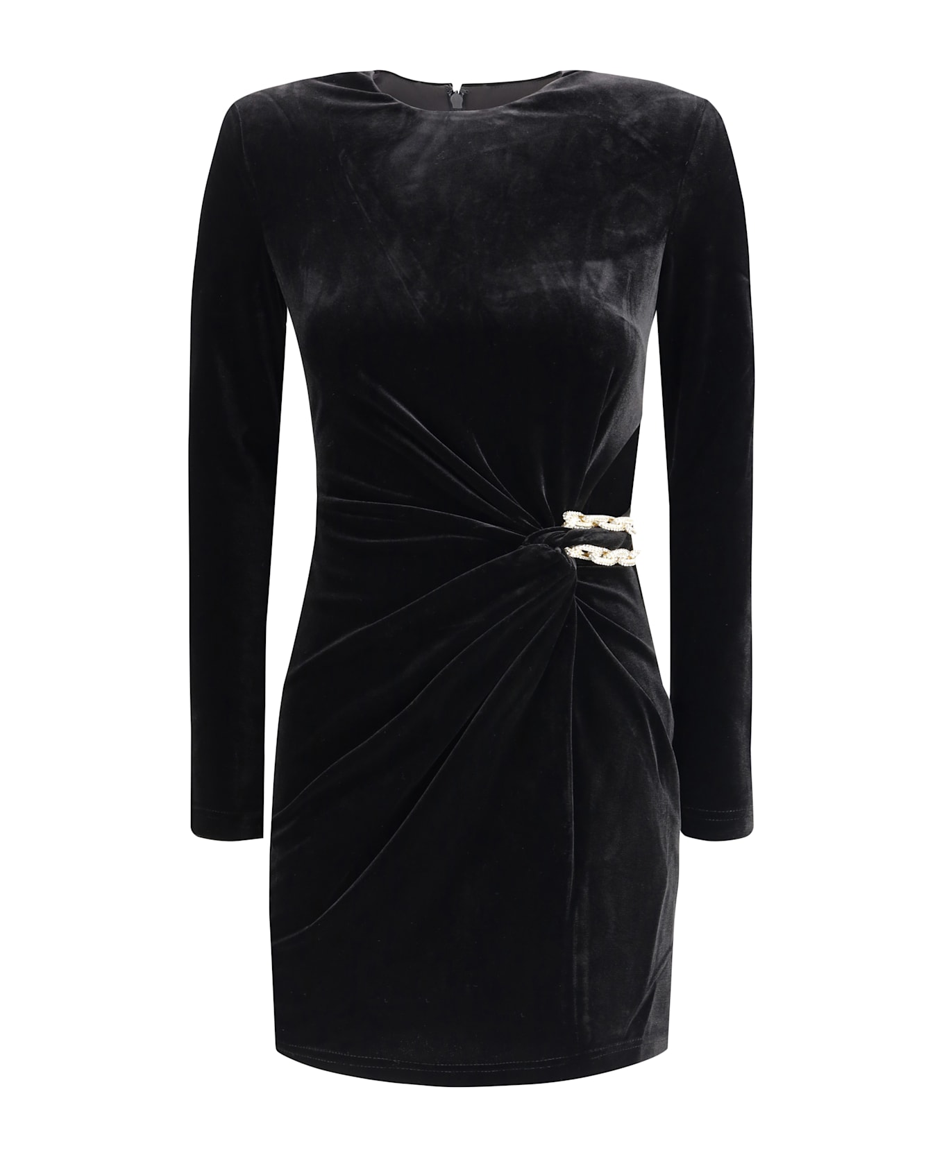 Self-portrait's short velvet dress is a bold and sophisticated piece perfect for the most special evenings. made of black velvet, it is enhanced by a deep side slit that gives a dramatic effect to the silhouette. gold chains with rhinestones add a contemporary and refined shine. a back zipper closure and removable straps complete the design for versatile, bold styling.