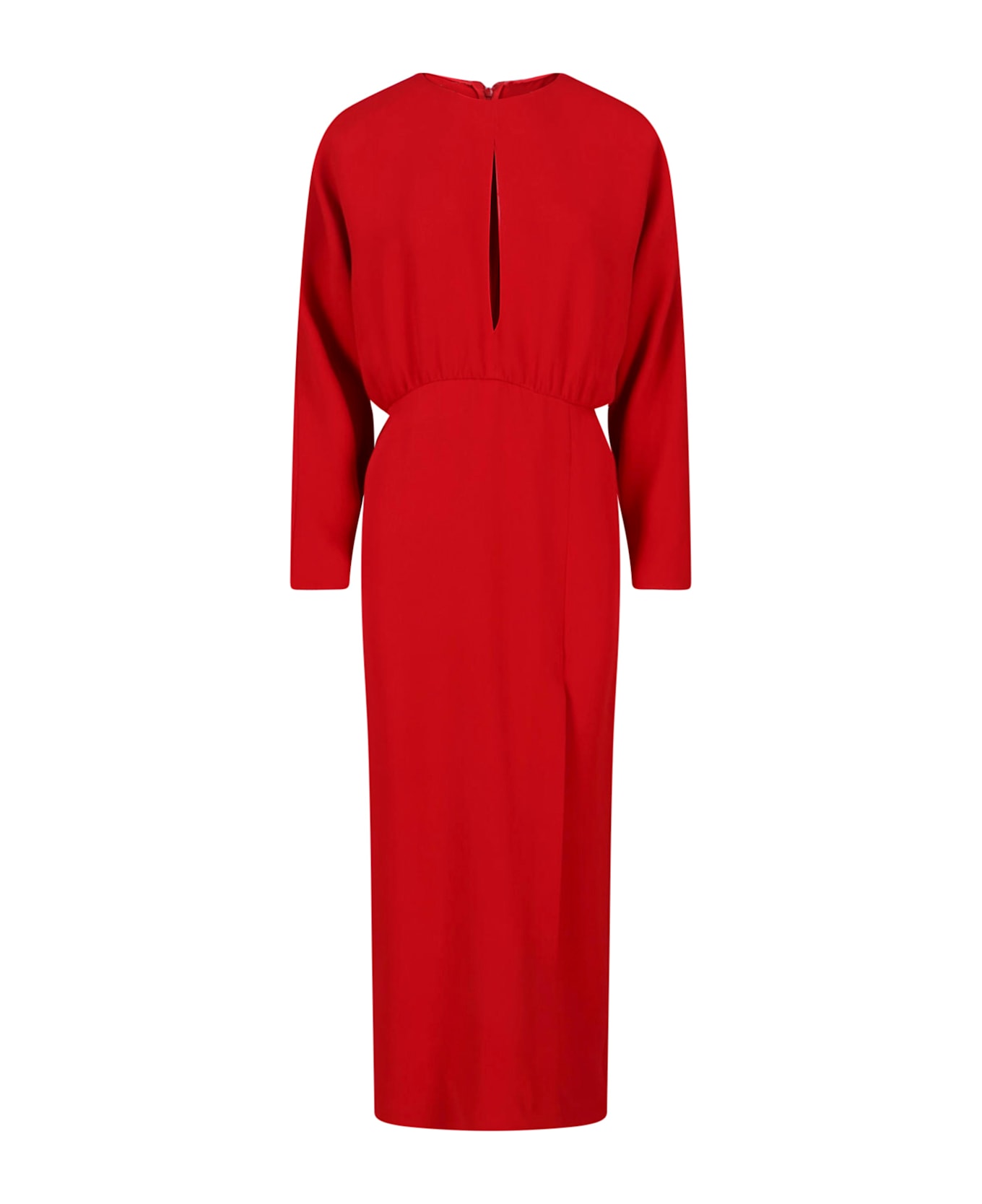 Valentino red silk maxi dress with round neckline, long sleeves, back zip closure, front slit, straight hem.