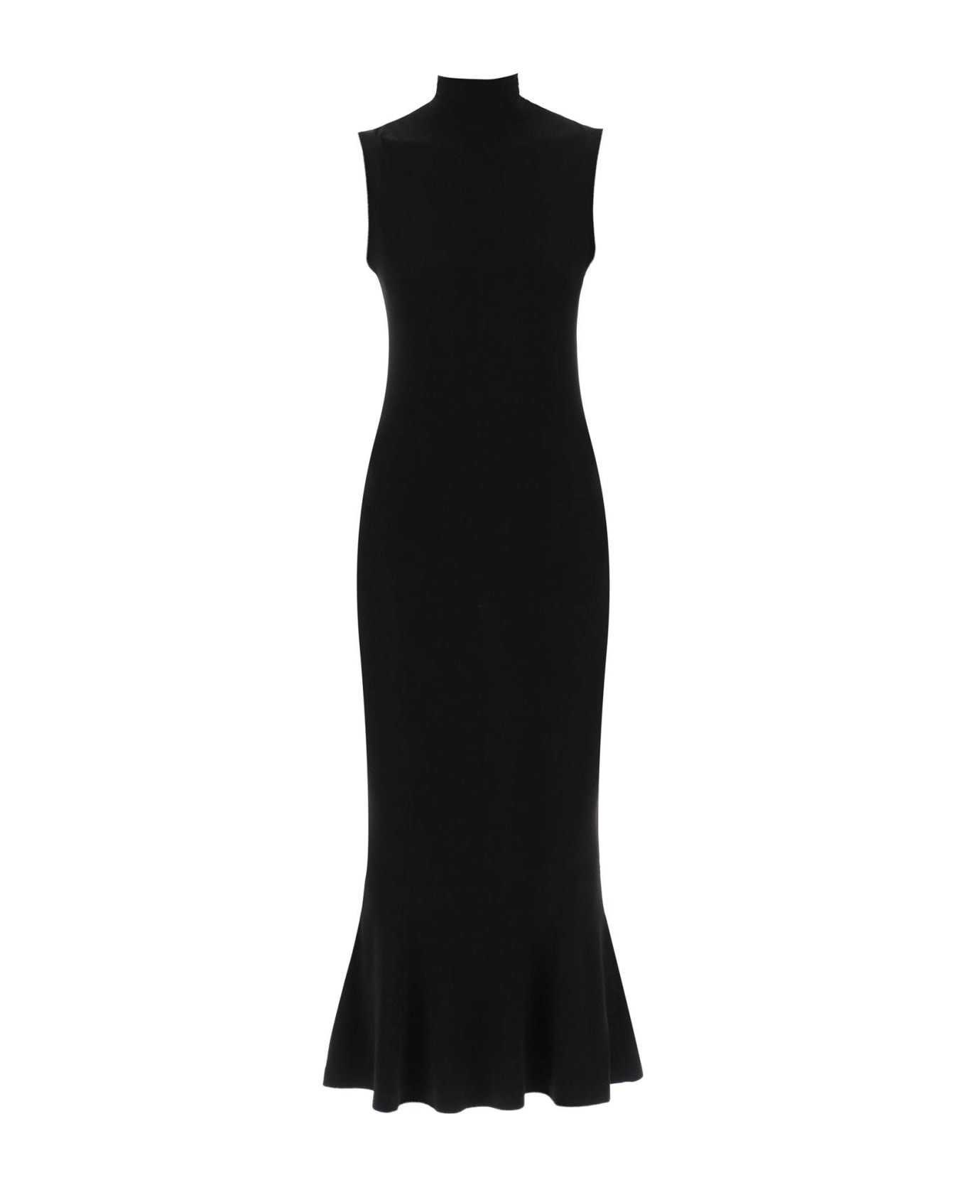 Norma Kamali sleeveless midi dress crafted in shiny-finish jersey. Fishtail design characterized by a waisted silhouette featuring turtleneck and back invisible zipper closure. The model is 177 cm tall and wears size XS. Composition: 95% PL, 5% EA