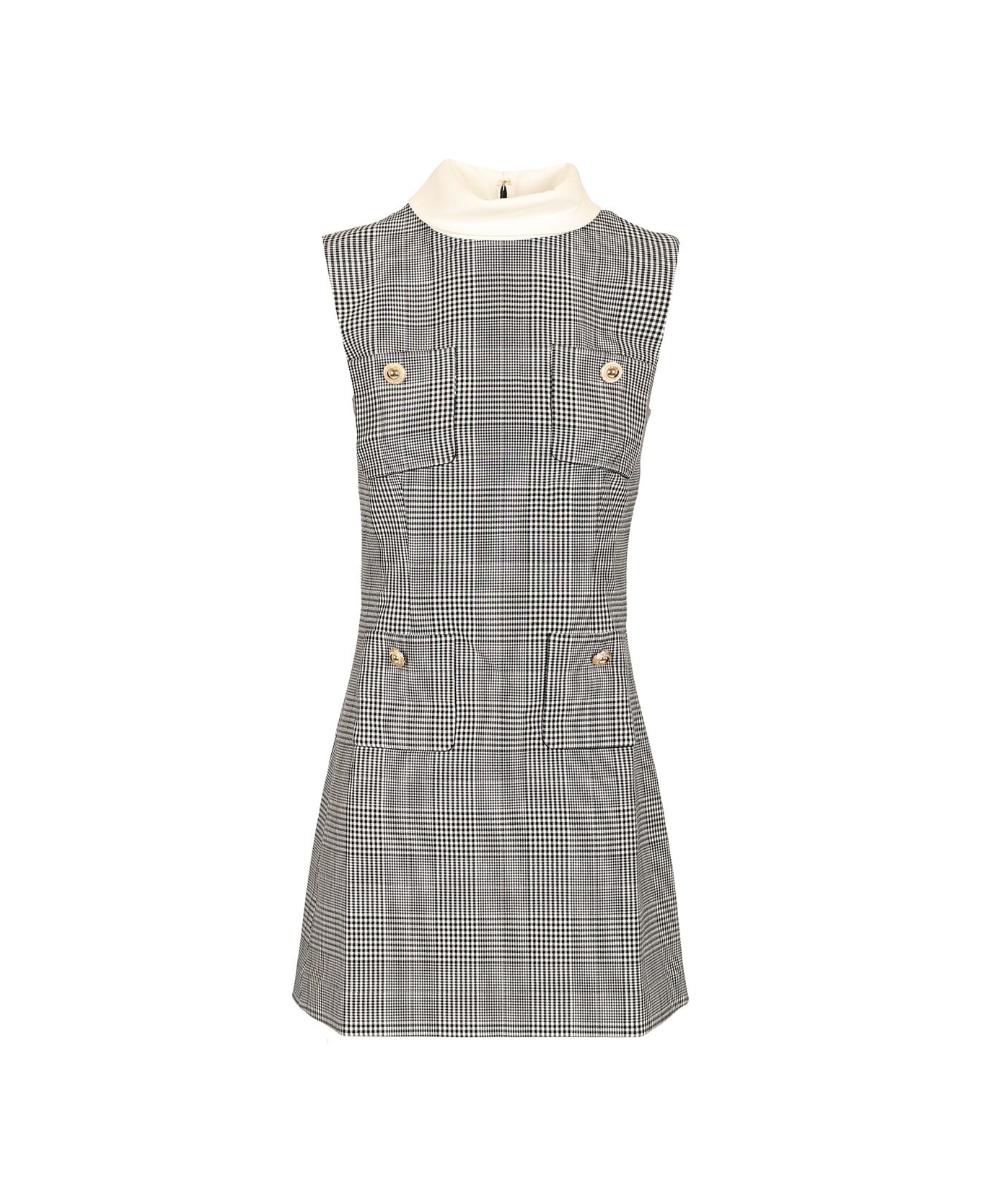 Sleeveless Prince of Wales mini dress from Self-Portrait featuring a high neck with gold buttons, a zip fastening to the back and patch pockets.