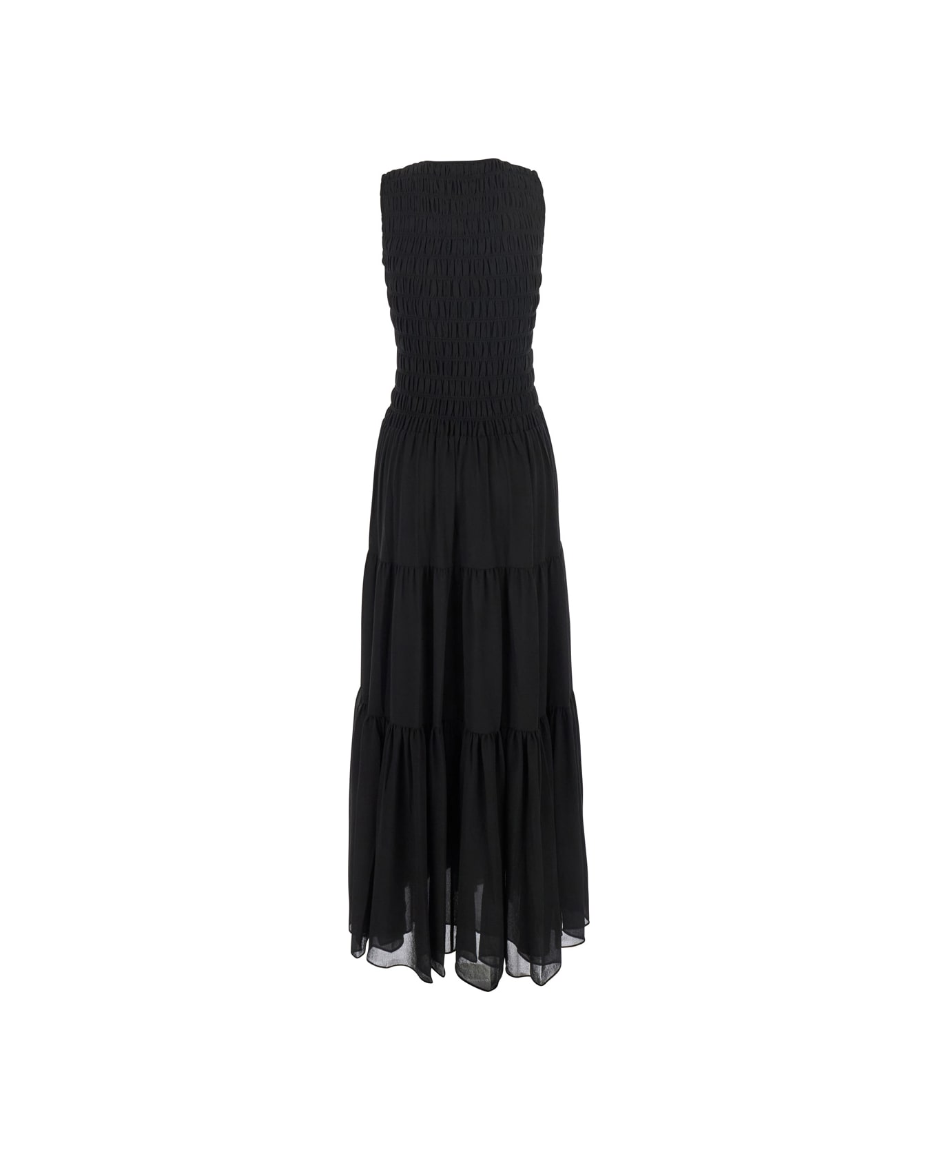 Black Crewneck Sleeveless Long Dress With Ruches And Ruffled Skirt In Tech Fabric Woman