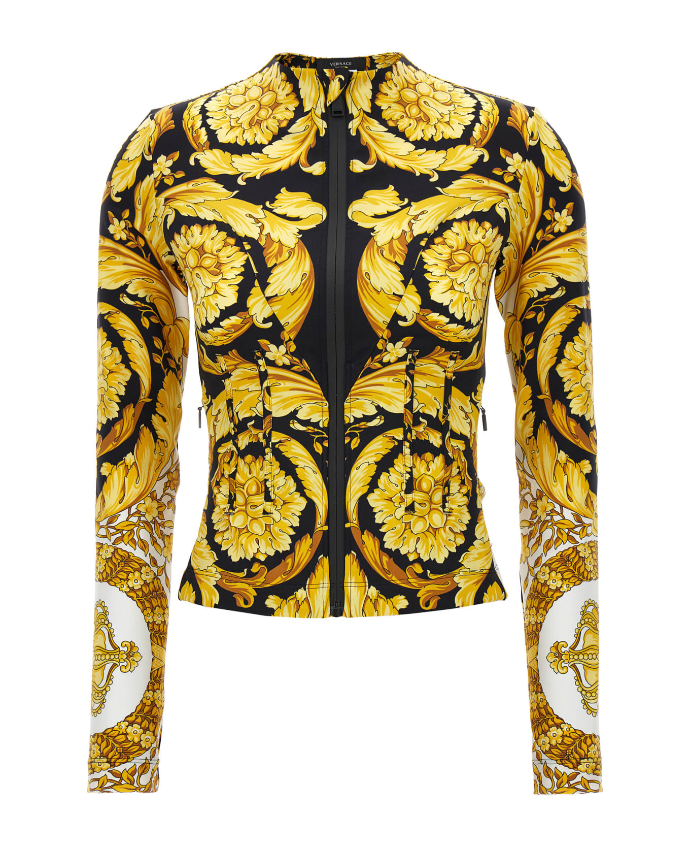 Stretch tech fabric sweatshirt with all over 'Barocco' print, a zip closure, zipped pockets and long sleeves. Composition: 50% polyamide 50% elastane