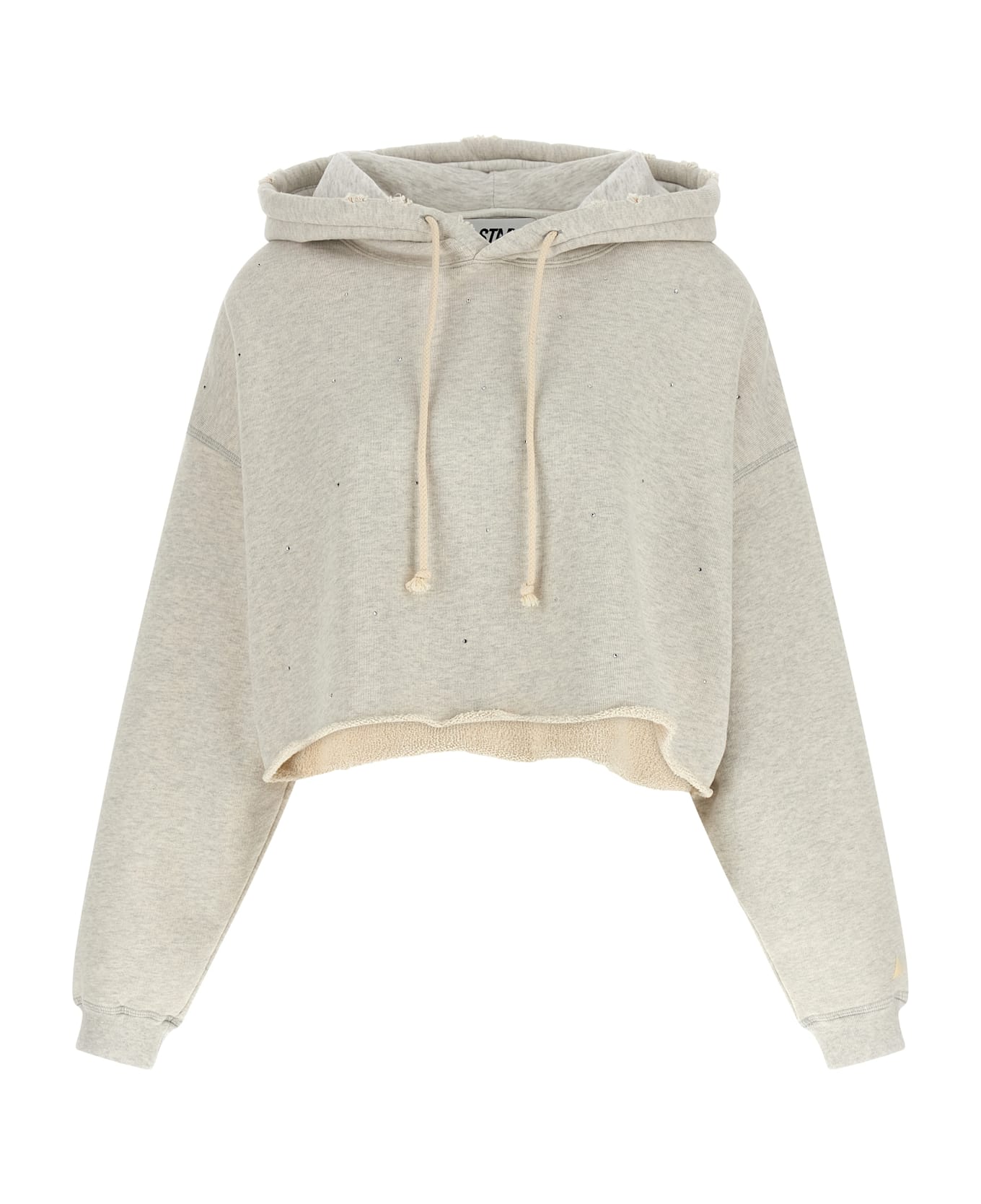 Used-effect mélange cotton terry hoodie with all-over crystal appliqué, Crop model, long sleeves with cuffs and dropped shoulder, garment bottom with raw cut hem.