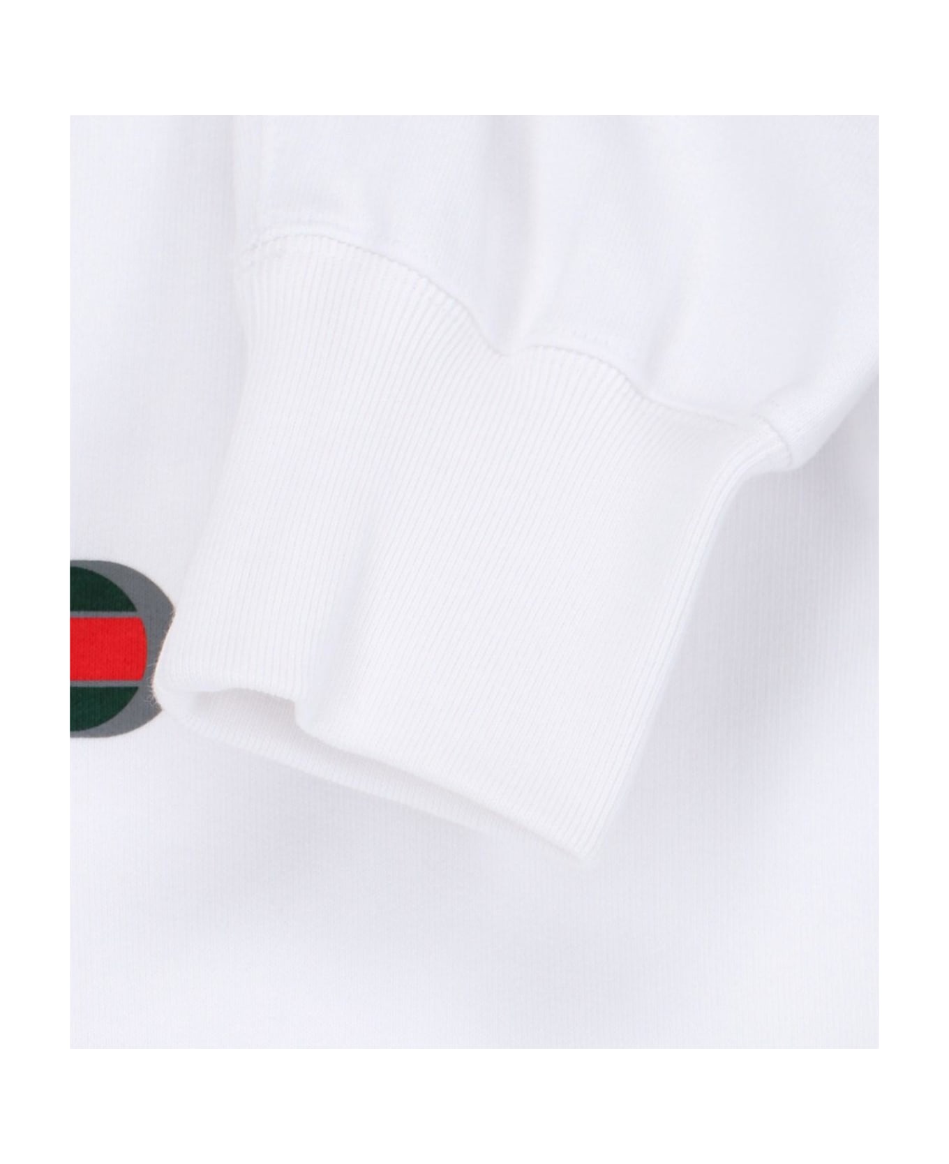 Gucci logo crewneck sweatshirt in white cotton jersey with tone-on-tone logo print on the front, green and red web print detail on the overlay, ribbed trim, straight hem.