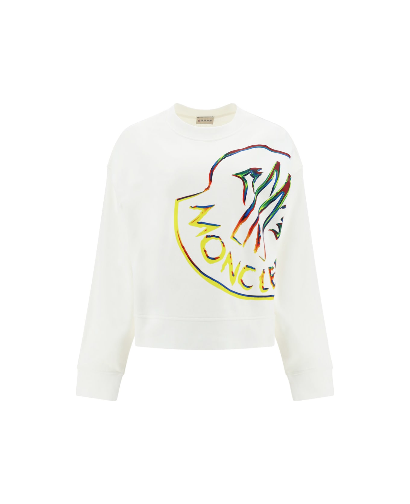 Cotton sweatshirt by moncler, ribbed crew neck, iconic multicoloured brand logo printed in contrasting colour on the front, ribbed cuffs, ribbed hem, slight side slits, oversize fit.