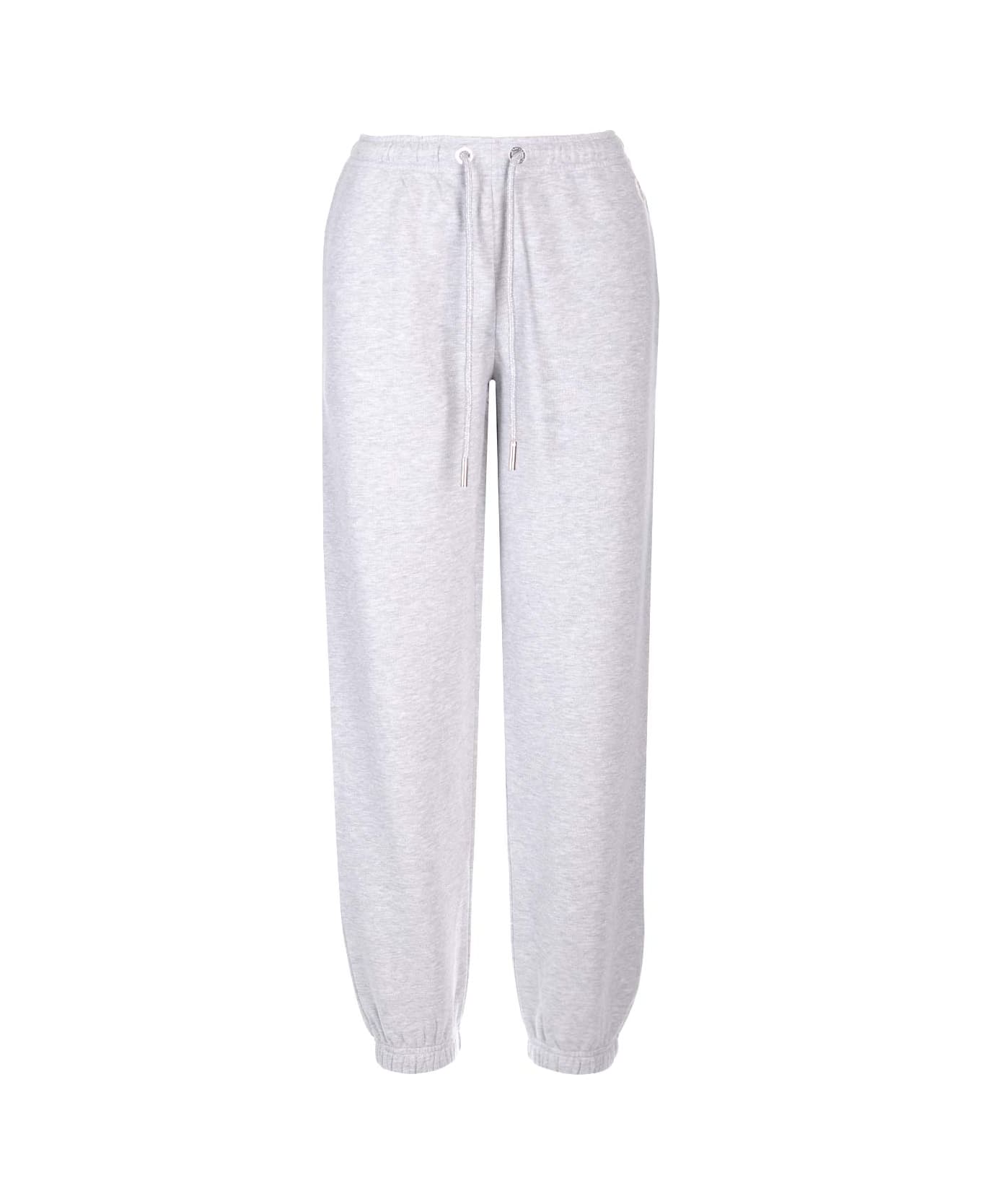 Grey sweatpants from Moncler in cotton jersey and metallic thread, waist with drawstring, two side pockets, logo patch with crystals.